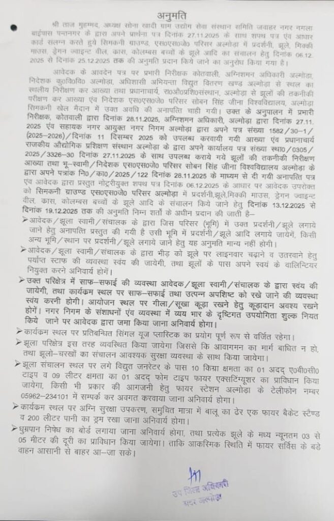 अल्मोड़ा-नगर व्यापार मंडल के सह सचिव अश्विन नेगी ने प्रेस को जारी एक बयान में कहा है कि सिमकनी मैदान में जो प्रदर्शनी आयोजित की जा रही थी उसकी परमिशन 13 दिसंबर से 19 दिसंबर 2025 तक तय थी।तय तिथि के बाद भी इसको बंद नहीं किया गया है। उन्होंने शासन और प्रशासन को चेताते हुए कहा कि अगर कल 21 दिसंबर से इस प्रदर्शनी को पूर्ण रूप से बंद नहीं किया गया तो वे समस्त व्यापारियो के साथ जाकर इसे बंद कराएंगे और इसके बाद कोई घटना घटती है तो इसकी संपूर्ण जिम्मेदारी शासन प्रशासन की होगी। उन्होंने कहा कि मैदान में पूरा बाजार इनके द्वारा लगा दिया गया है जिससे अल्मोड़ा का व्यापारी प्रभावित हो रहा है।