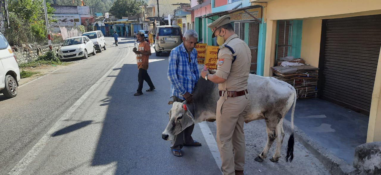 अल्मोड़ा-पुलिस उपमहानिरीक्षक कुमायूॅ परिक्षेत्र डा०नीलेश आनन्द भरणे द्वारा यातायात व्यवस्था व सड़क दुर्घटना में अंकुश लगाने के अभियान को सफल बनाने हेतु अवरोध रहित सुगम यातायात व्यवस्था पहल में वरिष्ठ पुलिस अधीक्षक पंकज भट्ट के निर्देशन में थानाध्यक्ष चौखुटिया दिनेश नाथ महन्त के नेतृत्व में मासी चौकी प्रभारी सुनील धानिक द्वारा क्षेत्र में घूम रहे बेजुबान पशु जो कि रात्रि में चलते वाहनों के सामने अचानक आने के कारण किसी प्रकार की दुघर्टना न हो, बेजुबान पशुओं के गले पर लगातार रिफ्लैक्टर की पट्टी लगाये जा रहे हैं। इसी क्रम में आज दिनॉक 14.10.2021 को चौकी प्रभारी द्वारा क्षेत्र में घूम रहे गायों के सींग में रिफ्लैक्टर लगाये गये।इस पहल से रेडियम की चमक एवं चालक की सतर्कता से वाहन दुर्घटना में कमी के साथ बेजुबान पशुओं की जान भी बच पायेगी।साथ ही सभी चालकों से निर्धारित गति से ही वाहन चलाने की अपील की है।जनपद पुलिस दुर्घटनाओं के अंकुश/सुगम यातायात के प्रयास में जुटी है।