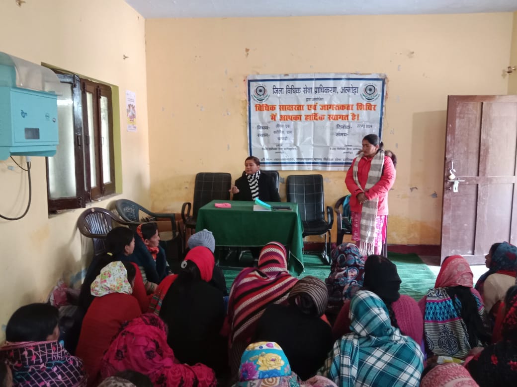अल्मोड़ा-उत्तराखंड राज्य विधिक सेवा प्राधिकरण नैनीताल के निर्देशन एवं अध्यक्ष जिला विधिक सेवा प्राधिकरण अल्मोड़ा श्रीकांत पाण्डेय के मार्गदर्शन में सुश्री शचि शर्मा सचिव जिला विधिक सेवा प्राधिकरण अल्मोड़ा द्वारा 15 फरवरी 2024 से 29 फरवरी 2024 तक समस्त जनपद अल्मोड़ा में चलाए जा रहें साइबर क्राइम, आनलाइन फ्राड व सोशल मीडिया स्कैम के सम्बन्ध में जागरूकता अभियान के अनुक्रम में दिनांक 27/02/2024 को ग्रामसभा- खत्याडी में विधिक जागरूकता शिविर का आयोजन किया गया व उपस्थित ग्रामीण महिलाओं को साइबर अपराध, ऑनलाइन धोखाधड़ी और सोशल मीडिया घोटाले की घटनाएं,नालसा (गरीबी उन्मूलन का प्रभावी कार्यान्वयन) योजना, 2015, गरीबी उन्मूलन के तहत केंद्रीय/राज्य कल्याण योजनाओं, ट्रांसजेंडर समुदाय के अधिकारों, सामाजिक अधिकारों, जिसमें स्वास्थ्य, आवास, रोजगार, पेंशन, शिक्षा तक पहुंच, न्याय तक पहुंच, बुनियादी सेवाएं, ई-ट्रू कॉपी मॉड्यूल, ई-सेवा केंद्र, मामलों की ई-फाइलिंग,पोश अधिनियम, सभी स्तरों पर पूर्ण और समान प्रतिनिधित्व और भागीदारी और सभी महिलाओं और लड़कियों के सशक्तिकरण, नालसा( नशीली दवाओं के दुरूपयोग से पीडितों के लिए कानूनी सेवाएं और नशीली दवाओं के खतरे का उन्मूलन योजना)2015,दिव्यांगजन कौशल विकास और दिव्यांगजन रोजगार सेतु एप ,जरूरतमंद व्यक्तियों/वादियों/आम लोगों को ऑनलाइन कानूनी सेवाएं हेल्पलाइन नंबर-15100, नालसा के वेब पोर्टल LSMS, LAIS एवं वेब साइट आदि की जानकारी दी गई तथा 09.03.2024 को आगामी लोक राष्ट्रीय लोक अदालत के विषय में बताया गया।पैरा लीगल वालियंटर नीमा बिनवाल उपस्थित रहीं।