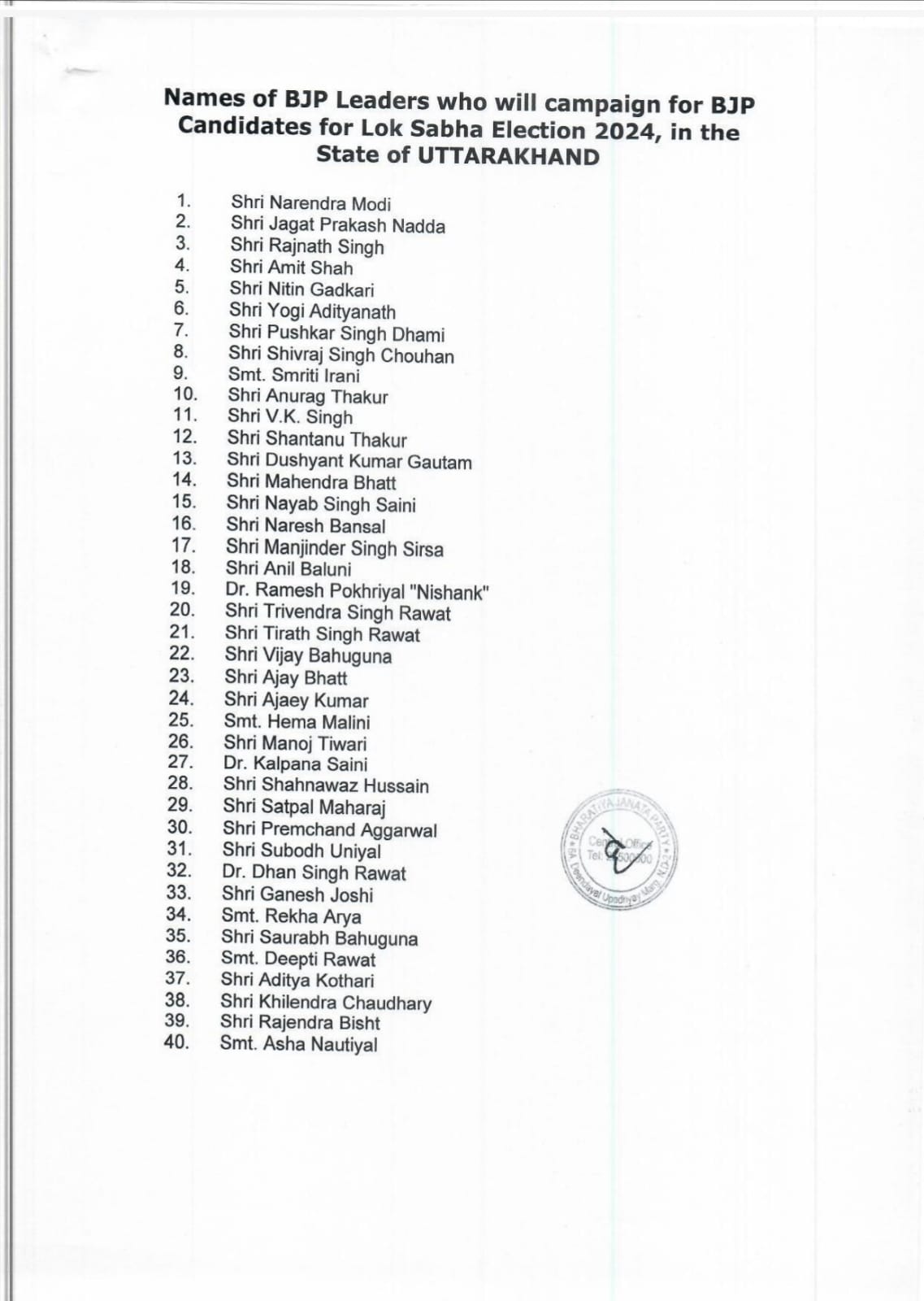 देहरादून-भाजपा ने लोक सभा चुनाव के लिए स्टार प्रचारकों की सूची जारी कर दी है।पार्टी के प्रदेश मीडिया प्रभारी मनवीर सिंह चौहान ने कहा कि प्रांतीय कमेटी के प्रस्ताव पर हाई कमान ने राज्य मे 40 स्टार प्रचारकों की सूची को अंतिम रूप दे दिया है।पीएम मोदी और राष्ट्रीय अध्यक्ष जे पी नड्ढा सहित कई वरिष्ठ नेता चुनावी जनसभा को संबोधित करेंगे।