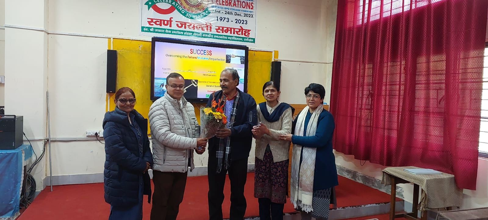 रानीखेत-दिनांक 16.02.2024 को राजकीय स्नातकोत्तर महाविद्यालय रानीखेत में डॉ० बी. एम. पाण्डे प्राचार्य राजकीय महाविद्यालय तल्ला सल्ट द्वारा महाविद्यालय के छात्र-छात्राओं को सफल जीवन हेतु अभिप्रेरण की भूमिका विषय पर एक विस्तृत व्याख्यान दिया गया।कार्यक्रम का शुभारंभ प्रो० पुष्पेश पांडे,प्राचार्य राजकीय स्नातकोत्तर महाविद्यालय रानीखेत द्वारा अतिथि को पुष्प गुच्छ व स्मृति चिन्ह प्रदान कर किया गया।अपने अभिभाषण में प्राचार्य डॉ. बी.एम. पांडे ने विद्यार्थियों को बताया कि किस प्रकार लक्ष्य निर्धारण किया जा सकता है तथा किस प्रकार सहज तरीकों,नियमित जीवनचर्या,अथक परिश्रम से इस लक्ष्य को साधा जा सकता है।इसके साथ ही वक्ता द्वारा सफलता प्राप्ति के विभिन्न चरणों पर सारगर्भित शब्दों में प्रकाश डाला गया। इसी क्रम में छात्र-छात्राओं को यह भी समझाया कि किस प्रकार सफलता प्राप्ति से जीवन में आनंद की अनुभूति की जा सकती है।कार्यक्रम के समापन में रानीखेत महाविद्यालय के प्राचार्य तथा कैरियर कांउसलिंग प्रकोष्ठ की सह-संयोजक डॉ० रश्मि रौतेला द्वारा अतिथि का धन्यवाद ज्ञापित करते हुए उन्हें महाविद्याल के स्वर्ण जयंति समारोह की यादगार भेंट की गई। कार्यक्रम का संचालन डॉ० कोमल गुप्ता व डॉ० निहारिका बिष्ट द्वारा किया गया तथा इसमें विभिन्न संकायों के छात्र-छात्राओं व प्राध्यापकों ने प्रतिभाग किया।