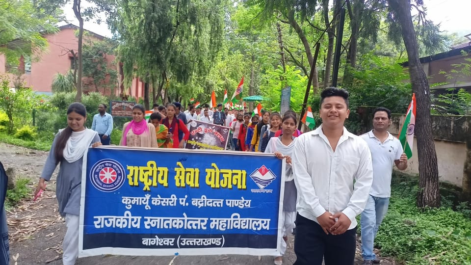 बागेश्वर-आज दिनांक 9/08/2022 को राजकीय महाविद्यालय बागेश्वर की राष्ट्रीय सेवा योजना इकाई,रोवर्स रेंजर्स और एनसीसी के कार्यक्रम अधिकारियों द्वारा हर घर तिरंगा कार्यक्रम के अंतर्गत जागरुकता हेतु महाविद्यालय से बज़ार तक पूरे जोश से प्रभारी प्राचार्य डॉ. एसएस धपोला के मार्गदर्शन में हर घर तिरंगा अभियान संबंधी जनजागरूकता रैली का आयोजन किया गया।रैली महाविद्यालय परिसर से बाजार तक भारत माता की जय,वंदे मातरम व देशभक्ति गीतों के जयघोष के साथ निकाली गयी।देशभक्ति की भावना से ओत-प्रोत स्वयंसेवियों ने रैली के माध्यम से स्थानीय निवासियों को 13,14 व 15 अगस्त को तिरंगा फहराने के लिए जागरूक किया। महाविद्यालय के प्राध्यापकों द्वारा छात्र/छात्राओं को हर घर तिरंगा अभियान की विस्तृत जानकारी दी गयी।प्रत्येक स्वयंसेवी ने अपने अपने घरों में दिनांक 13 अगस्त,14 अगस्त व 15 अगस्त को तिरंगा फहराने का संकल्प लिया।कार्यक्रम में महाविद्यालय के समस्त प्राध्यापक,कर्मचारीगण,स्वयंसेवियों मौजूद रहे।