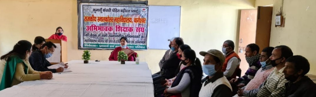 बागेश्वर-बुद्ववार को राजकीय स्नातकोत्तर महाविद्यालय बागेश्वर में अभिभावक शिक्षक संघ के गठन हेतु बैठक आहूत की गयी।इस बैठक में अभिभावक शिक्षक संघ 2020-21 का गठन किया गया।बैठक में विनोद भौर्याल को अध्यक्ष, श्रीमती सुनीता हरड़िया को उपाध्यक्ष, डा० हेमलता पाण्डेय को सचिव,नारायण सिंह को उपसचिव,कैलाश सिंह को कोषाध्यक्ष चुना गया।इसके अलावा डा०नेहा भाकुनी,डा०जगवती एवं लक्ष्मण सिंह देव को संघ का सदस्य बनाया गया।बैठक में आगामी परीक्षाओं के सम्बन्ध में भी चर्चा की गयी तथा प्राचार्य द्वारा अभिभावकों को अवगत कराया गया कि विश्वविद्यालय द्वारा शैक्षणिक सत्र को नियमित किये जाने हेतु प्रयास किये जा रहे हैं।बैठक में यह भी अवगत कराया गया कि भविष्य में महाविद्यालय के शैक्षणिक माहौल में सुधार हेतु अभिभावकों के सुझाव लिए जा रहे हैं।