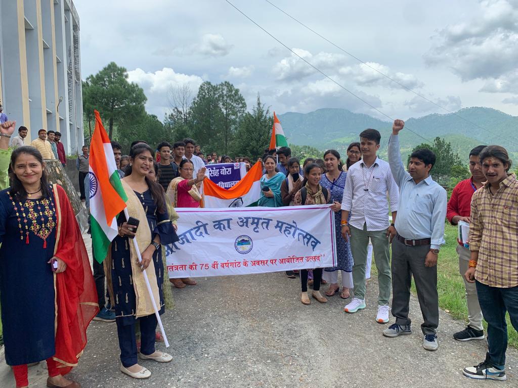 सोमेश्वर-दिनांक 8 अगस्त को हुकुम सिह बोरा राजकीय स्नातकोतर महाविद्यालय सोमेश्वर में आजादी का अमृत महोत्सव कार्यक्रम के अन्तर्गत महाविद्यालय के प्राध्यापको द्वारा स्वतन्त्रता सेनानियों की जानकारी तथा तिरंगे से सम्बन्धित जानकारी दी गयी।तत्पश्चात छात्र छात्राओं द्वारा प्राचार्य प्रो० डा० हेमा प्रसाद के निर्देशन मे तिरंगा रैली निकाली गयी। तिरंगा रैली में राहुल जलाल,पवन पाण्डे,प्रेम प्रकाश,शंकर,सपना,पूजा , ललिता,मीना,दीपा,आरती पाण्डे, डा.सी.पी.वर्मा,डा राकेश पाण्डेय,डा कंचन वर्मा,डा. आचल,डा विवेक,डा शालिनी,डा प्राची,डा विपिन,डा संजू , ललित,सचिन,नरेन्द आदि उपस्थित रहे।