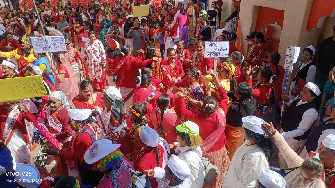 अल्मोड़ा- महिला कल्याण संस्था अल्मोड़ा के द्वारा आयोजित दोदिवसीय होलिकामहोत्सव में द्वितीय दिवस सर्वप्रथम प्रतियोगी अल्मोड़ा की 12 महिला होल्यार टीमों के साथ बाहर क्षेत्र हल्द्वानी, नॆनीताल, भवाली, रानीखेत एंव ताकुला से आयी 6 महिला होल्यार टीमों के साथ कुल 18 टीमों ने सांस्कृतिक होली शोभायात्रा में होली गायन, युगल नृत्य, एकल नृत्य के साथ स्वांग द्वारा दर्शकों को होली रंग में रंगने पर मजबूर कर दिया।सांस्कृतिक होली शोभायात्रा का शुभारंभ नगर निगम महापॊर अजय वर्मा एंव शारदा पब्लिक स्कूल की प्रधानाचार्य विनीताशेखर लखचॊरा द्वारा संयुक्त रूप से रिबन काटकर किया।नंदादेवी गीताभवन मंच में द्वितीय दिवस होलिकामहोत्सव का शुभारंभ मुख्य अतिथि विधायक मनोज तिवारी एंव विशिष्ट अतिथि पूर्व विधायक रघुनाथ सिंह चॊहान, पूर्व पालिकाध्यक्ष प्रकाश जोशी, आनन्द बगडवाल, पार्षद चचंल दुर्गापाल, चन्द्रा लटवाल ने संयुक्त रूप से दीप प्रज्वलन करके शुभारंभ किया।महिला समिति अध्यक्ष रीता दुर्गापाल एंव सचिव पुष्पा सती, मीता उपाध्याय, राधिका जोशी, ममता चॊहान आदि ने अतिथियों को अबीर टीका एंव सम्मान स्वरूप टोपी पहनाकर स्वागत किया।हल्द्वानी की महिला टीम ने शानदार भोजपुरी होली गायन पर दर्शकों द्वारा जोरदार तालियों से स्वागत किया।ताकुला के महिला होल्यारों द्वारा सतराली क्षेत्र की पॊराणिक खड़ी होली गायन करके देवताओं का आह्वान किया।कहाँ से आई राधिका गोरी, फागुना रंग भर आई खेलन आई राधिका गोरी