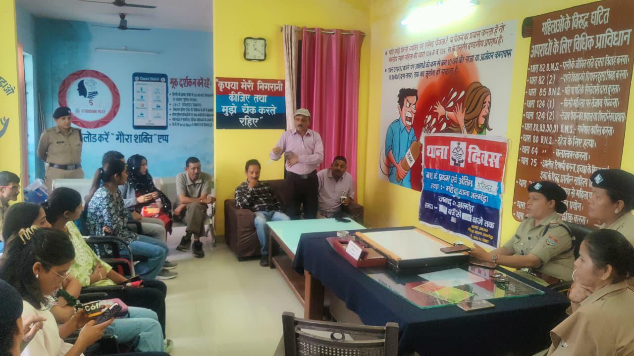 अल्मोड़ा-देवेन्द्र पींचा एसएसपी अल्मोड़ा के निर्देशन में अपर पुलिस अधीक्षक हरबन्स सिंह व सीओ अल्मोड़ा गोपाल दत्त जोशी के पर्यवेक्षण में जानकी भण्डारी के नेतृत्व में दिनांक 23.08.2025 को महिला थाना में थाना दिवस का आयोजन किया गया।जिसमें कस्बा क्षेत्र के क्षेत्रवासी सम्मिलित रहें। कार्यक्रम के दौरान प्रभारी निरीक्षक महिला थाना ने उपस्थित लोगों से समस्याओं के बारे में जानकारी ली, जिस पर स्थानीय नागरिकों ने अपनी समस्याएं और सुझाव पुलिस के समक्ष रखें,जिनका मौके पर ही निस्तारण किया गया तथा कुछ प्रकरणों का शीघ्र समाधान हेतु आश्वासन दिया गया।इस दौरान क्षेत्र में यातायात व्यवस्था बनाये रखने के साथ-साथ आधुनिक साइबर फ्रॉड के तौर-तरिके, नशा मुक्ती, घरेलू हिंसा, महिला उत्पीड़न, बाल विवाह एवं महिला अपराध, एवं नवीन कानून के संबंध में जागरूक किया गया।इसके अतिरिक्त डायल-112, महिला हेल्प लाईन नंबर-1090, साइबर हेल्पलाइन नंबर-1930,चाइल्ड हेल्पलाइन नम्बर-1098, आपदा हेल्पलाइन नम्बर-1070, के संबंध में विस्तृत जानकारियां दी गयी।