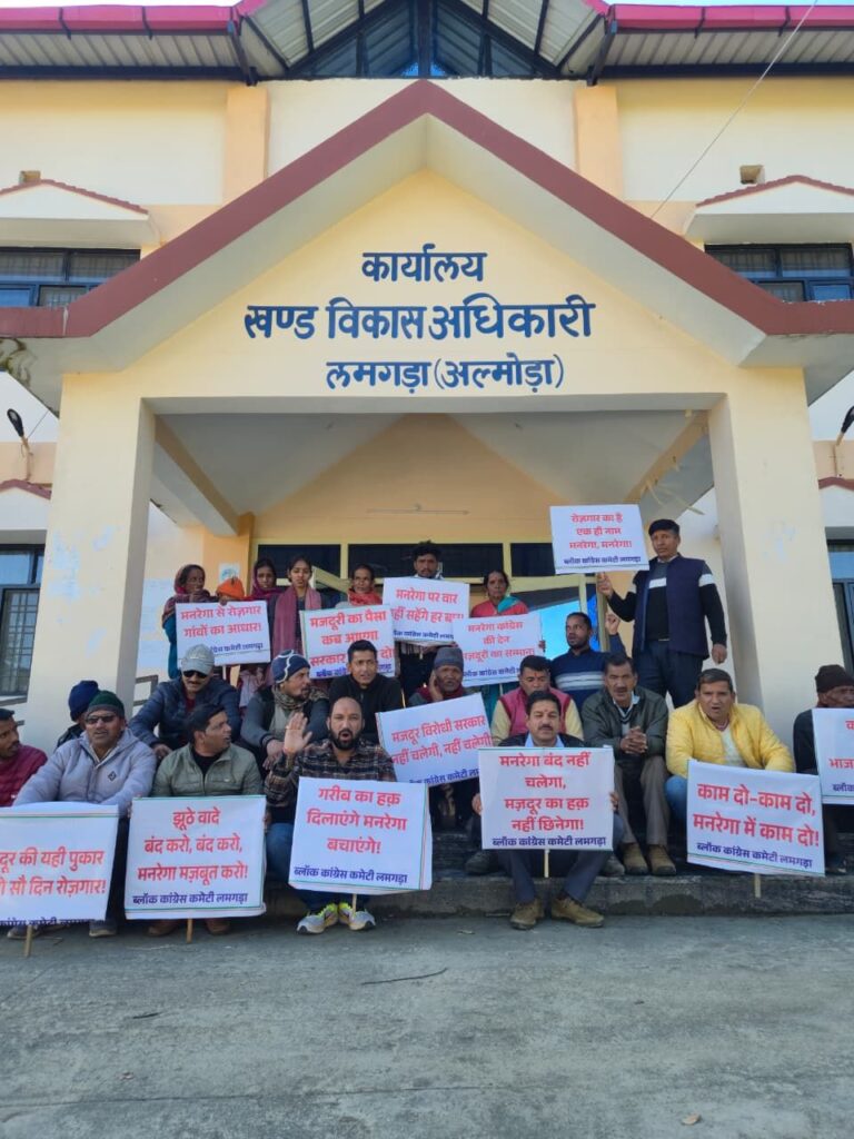 अल्मोड़ा-हवालबाग़ ब्लॉक मुख्यालय में आज कांग्रेस पार्टी द्वारा मनरेगा बचाओ अभियान के तहत एक दिवसीय धरना प्रदर्शन आयोजित किया गया। इस धरने के माध्यम से केंद्र व राज्य सरकार द्वारा मनरेगा योजना को कमजोर किए जाने,मजदूरों को समय पर रोजगार न मिलने और लंबित मजदूरी भुगतान के खिलाफ जोरदार विरोध दर्ज कराया गया।धरने को संबोधित करते हुए कांग्रेस जिलाध्यक्ष भूपेंद्र सिंह भोज ने कहा कि मनरेगा देश की गरीब,ग्रामीण जनता की जीवनरेखा है,लेकिन भाजपा सरकार जानबूझकर बजट में कटौती कर,भुगतान में देरी कर तथा काम बंद कर इस योजना को समाप्त करने की साजिश कर रही है।इसका सीधा असर गरीब मजदूरों,महिलाओं और ग्रामीण अर्थव्यवस्था पर पड़ रहा है।कांग्रेस कार्यकर्ताओं ने मांग की कि सभी मनरेगा मजदूरों को 100 दिन का रोजगार सुनिश्चित किया जाए,लंबित मजदूरी का तत्काल भुगतान किया जाए,