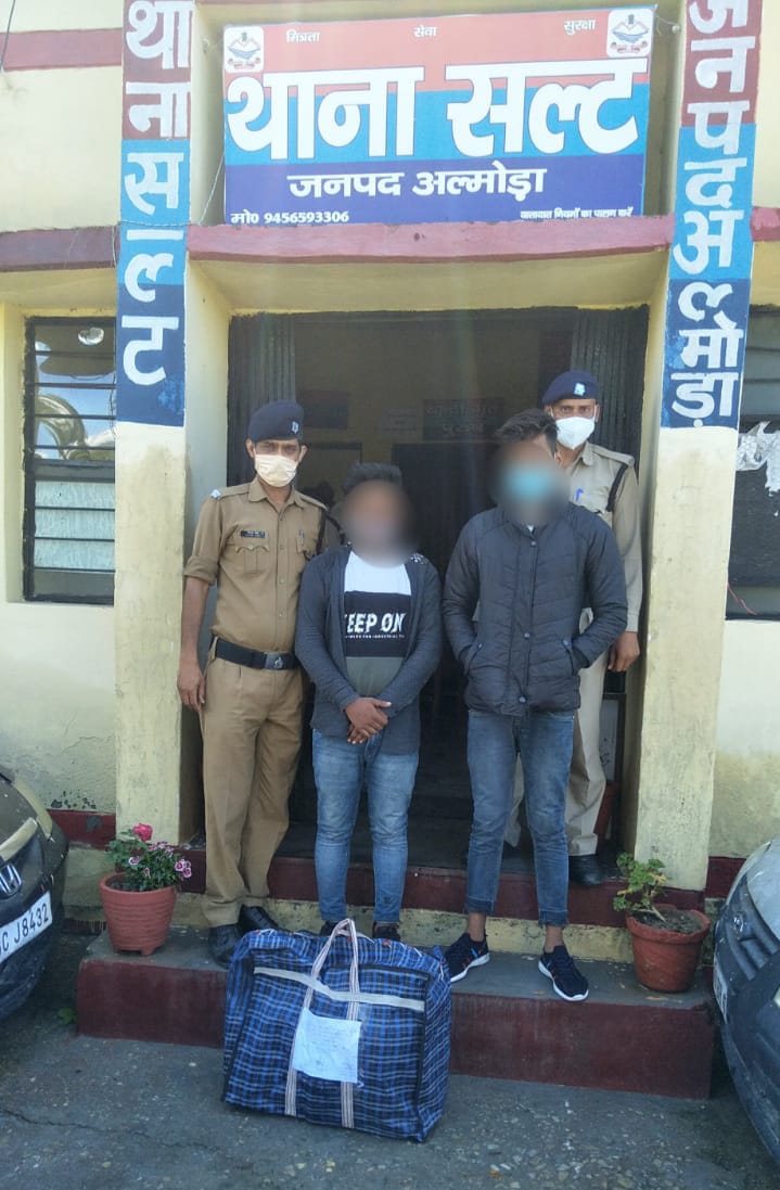 अल्मोड़ा-पंकज भट्ट वरिष्ठ पुलिस अधीक्षक अल्मोड़ा द्वारा सभी थाना चौकी प्रभारियों को अपने अपने क्षेत्र में अवैध रूप से गाँजा/चरस व अन्य नशीली पदार्थो की तस्करी कर रहे तस्करों पर कार्यवाही करने के निर्देश पर दिनांक 20.06.2021 को प्रभारी थानाध्यक्ष सल्ट गिरीश पंत,कानि० सुरेश चन्द्र,दीपक सिंह,कानि० मनमोहन सिंह एसओजी द्वारा नेल कमान तिराहा सल्ट के पास बिना नम्बर प्लेट यामाहा आर15 मोटर साईकिल से फहीम अहमद पुत्र फरियाद हुसैन निवासी चिलकिया रामनगर जिला नैनीताल उम्र 22 वर्ष तथा समीर पुत्र यामीन निवासी लखनपुर चुंगी रामनगर जिला नैनीताल उम्र 19 वर्ष के कब्जे से कुल 10.36 किलोग्राम अवैध गांजा कीमत ₹53600 परिवहन करते हुए पकड़े जाने पर थाना सल्ट में मु०अ0० सं० 10/21 धारा 8/20/60 एन०डी०पी०एस०एक्ट पंजीकृत कर वैधानिक कार्रवाई की गई।प्रभारी थानाध्यक्ष गिरीश पंत ने बताया कि अभियुक्त फहीम अहमद प्लम्बर का कार्य तथा समीर टैक्सी चालक है। उक्त अभियुक्तगण द्वारा रसिया महादेव से गांजा एकत्रित कर बेचने के लिए रामनगर ले जा रहे थे।