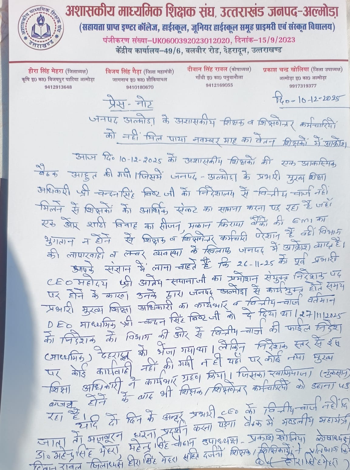 अल्मोड़ा-अशासकीय शिक्षकों व शिक्षणेत्तर कर्मचारियों की बुधवार को वर्चुअल बैठक आयोजित की गई।बैठक के दौरान शिक्षकों ने नवंबर माह का अब तक वेतन नहीं मिलने पर नाराजगी जताई।वर्चुअल बैठक में अशासकीय शिक्षकों ने कहा कि 26 नवम्बर को जिले के पूर्व प्रभारी सीईओ अत्रेश सयाना का प्रमोशन संयुक्त पद पर हो गया था।उनके कार्यमुक्त होने पर सीईओ का कार्यभार डीईओ माध्यमिक चंदन सिंह बिष्ट को दिया गया लेकिन निदेशक स्तर से वित्तीय चार्ज की फाइल पर कोई कार्रवाई नहीं की गई और ना ही किसी नए मुख्य शिक्षा अधिकारी ने कार्यभार ग्रहण किया।इस कारण नए प्रभारी सीईओ को वित्तीय चार्ज नहीं मिल सका है।कहा कि इसका खामियाजा शिक्षकों व कर्मचारियों को भोगना पड़ रहा है।बजट होने के बाद भी उन्हें वेतन नहीं मिल पा रहा है। शिक्षकों ने दो दिन के भीतर सीईओ को वित्तीय चार्ज देने की मांग की।अन्यथा आंदोलन की चेतावनी दी।यहां मंडलीय महामंत्री डॉ महेंद्र सिंह मेहरा, जिलाध्यक्ष हीरा सिंह मेहरा, महेंद्र सिंह चौहान,जिला उपाध्यक्ष प्रकाश सिंह खोलिया, कोषाध्यक्ष दीवान सिंह रावत आदि रहे।