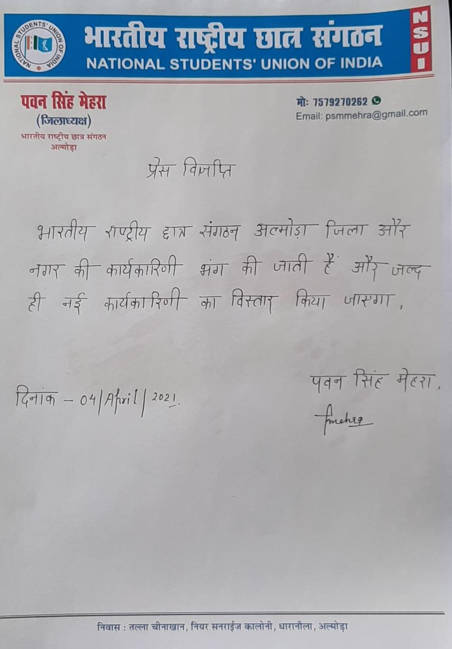 अल्मोड़ा-भारतीय राष्ट्रीय छात्र संगठन के अल्मोड़ा जिलाध्यक्ष पवन सिंह मेहरा ने जिला और नगर कार्यकारिणी भंग कर दी है।उन्होंने बताया कि शीघ्र ही नयी कार्यकारिणी का गठन कर विस्तार किया जाएगा।