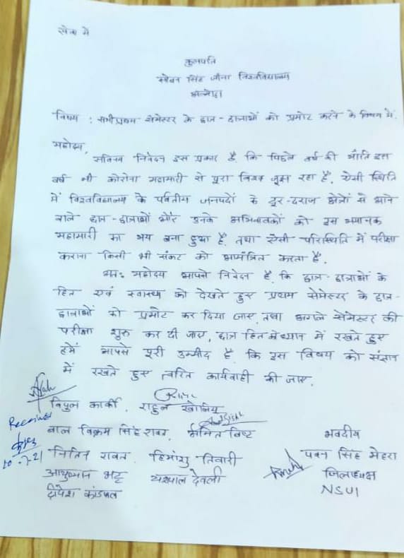 अल्मोड़ा-छात्र नेता राहुल खोलिया ने कहा कि अभी कोरोना महामारी से पूरा विश्व जूझ रहा है,ऐसे में विश्वविद्यालय के पर्वतीय जनपदों में दूर-दराज से आने वाले छात्र -छात्राओं और उनके अभिभावकों में इस भयानक महामारी का भय बना हुआ है और साथ ही कहा कि अभी तक विश्वविद्यालय द्वारा चलाई जा रही ऑनलाइन कक्षाओं का भी सफलता पूर्वक संचालन नहीं हो पा रहा है।ऐसी परिस्थिति में परीक्षा कराना किसी भी संकट को आमंत्रित करना है।इस मौके पर जिलाध्यक्ष पवन मेहरा ने कहा कि छात्र -छात्राओं के हितों और स्वास्थ्य को देखते हुए प्रथम सेमेस्टर के छात्र -छात्राओं को प्रमोट कर दिया जाए तथा अगले सेमेस्टर की परीक्षा शुरू कर दी जाए। छात्र हितों को ध्यान में रखते हुए हमें आपसे पूरी उम्मीद है कि इस विषय को संज्ञान में रखते हुए त्वरित कार्यवाही की जाए।इस मौके पर बाल विक्रम सिंह रावत,विपुल कार्की,नितिन रावत,अमित बिष्ट,हिमांशु तिवारी,आयुष्मान भट्ट,यशपाल देवली,दीपेश कांडपाल उपस्थित रहे।