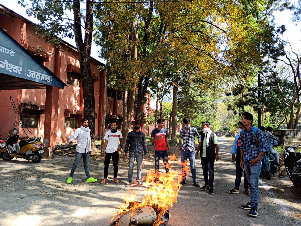बागेश्वर-आज भारतीय राष्ट्रीय छात्र संगठन बागेश्वर ने जिला कोषाध्यक्ष रूद्रा पाण्डे के नेतृत्व में राजकीय स्नातकोत्तर महाविद्यालय बागेश्वर के प्रांगण में कुलपति का पुतला दहन किया।इस अवसर पर एन०एस०यू०आई० कोषाध्यक्ष रूद्रा पाण्डेय ने कहा कि महाविद्यालय में छात्र-छात्राऐं अनेक परेशानियों से जूझ रहे हैं पर महाविद्यालय प्रशासन इस ओर ध्यान नहीं दे रहा है।उन्होंने कहा कि महाविद्यालय में प्रतिवर्ष छात्र छात्राओं के लिए जो दस प्रतिशत सीटें बढ़ाई जाती हैं उन्हें अविलम्ब बढा़या जाए।छात्र छात्राओं को आनलाईन डिग्री,आनलाईन प्रोविजनल की सुविधा उपलब्ध कराई जाए।उन्होंने कहा कि जो परीक्षाफल घोषित किये जा चुके हैं उसमें बिना बैक के परीक्षाफल घोषित कर दिया गया है जिसमें संसोधन किया जाए।उन्होंने कहा कि छात्रहित में अविलम्ब यदि उनकी मांगें नहीं माई जाती हैं तो उनका संघर्ष जारी रहेगा।पुतला दहन कार्यक्रम में एन०एस०यू०आई०कोषाध्यक्ष रूद्रा पाण्डे,पूर्व छात्रसंघ उपाध्यक्ष गोविन्द चन्दोला,महासंघ कोषाध्यक्ष गणेश कुमार,पूर्व सहसचिव तनुज कर्मयाल, छात्रसंघ उपाध्यक्ष जयदीप कुमार,एन०एस०यू०आई०नगर उपाध्यक्ष संजय जोशी,नगर सचिव एन०एस०यू०आई०देवेन्द्र मेहरा,दिव्यांशु कुमार,रोहित भारती सहित अन्य लोग शामिल रहे।