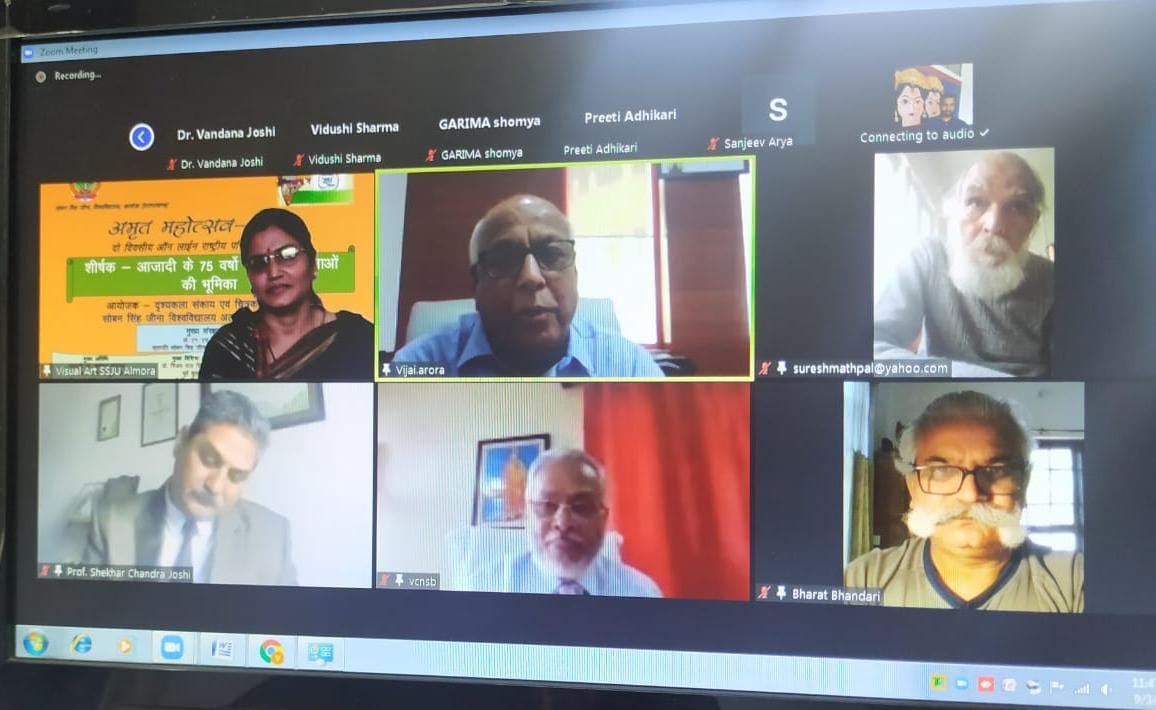 अल्मोड़ा-सोबन सिंह जीना विश्वविद्यालय अल्मोडा में अमृत महोत्सव 2021 के अन्तर्गत दृश्यकला संकाय एवं चित्रकला विभाग द्वारा आयोजित आनलाईन दो दिवसीय राष्ट्रीय परिचर्चा (वेबिनार) के प्रथम दिन 3 सितंबर 2021 को उद्घाटन सत्र का शुभारम्भ सरस्वती वंदना एवं राष्ट्रगान के साथ हुआ।प्रो० एन०एस०भंडारी कुलपति सोबन सिंह जीना विश्वविद्यालय अल्मोड़ा ने मुख्य अतिथि पद्म श्री डा० यशोधर मठपाल संस्थापक लोकसंस्कृति संग्रहालय गीताधाम भीमताल,मुख्य विशिष्ट अतिथि प्रो० वी०पी०एस० अरोरा पूर्व कुलपति कुमाऊं विश्वविद्यालय नैनीताल एवं कार्यक्रम मे उपस्थित आमंत्रित अतिथि वक्ता का स्वागत कर किया।उन्होंने कहा कि हमारे बीच उपस्थित मुख्य अतिथि मठपाल जी उत्तराखंड की कला के महान संरक्षक है।आपका वक्तव्य सभी के लिए अमूल्य होगा एवं मुख्य विशिष्ट अतिथि प्रो०अरोरा जी जिन्होंने दृश्यकला संकाय एवं इस परिसर के विकास और विस्तार के लिए कुलपति के रूप में रहते हुऐ सराहनीय कार्य किया है जिनके ऊर्जावान विचारों से प्रतिभागी अवश्य ही लाभान्वित होंगे। उन्होंने कहा कि दृश्यकला संकाय एवं चित्रकला विभाग सदैव क्रियाशील रहता है।इससे संकाय और विभाग के विद्यार्थियों का निरंतर बौध्दिक विकास हो रहा है।कहा कि यह आयोजन स्वतंत्रता आंदोलनकारियों के भावपूर्ण स्मरण मे आयोजित किया गया है,जिससे कि हम सभी उन वीरों के बलिदान को स्मरण रखें और युवा वर्ग को उनसे जोड़े यही इस अमृत महोत्सव की सार्थकता होगी।विशिष्ट अतिथि प्रो०अरोरा ने कहा कि भारत वर्ष स्वतन्त्रता के 74 वर्षों मे पुनः अपने प्राचीन गौरवशाली रूप मे विश्व पटल पर स्थापित हुआ है विभिन्न देशों से युवा भारत मे अध्ययन के लिए आ रहे है।शिक्षा एवं कला मे तकनीक के प्रभाव से क्रांतिकारी विकास हुये है। दृश्यकला का आज बहुत ही अधिक विकास हुआ है इस क्षेत्र मे रोजगार की अपार संभावनाएं बढ़ी है।मुख्य अतिथि पद्म श्री डा० यशोधर मठपाल ने भारतीय कला के गौरवशाली अतीत पर प्रकाश डाला और कहा कि स्वतंत्रता आंदोलन के मध्य कलाकारों ने जन जागरण का कार्य किया है। उन्होंने स्वयं महात्मा गांधी के साथ संघर्ष किया है।उन्होंने कहा कि हम सभी को इस स्वतंत्रता की रक्षा और सम्मान करना चाहिए उन्होंने कार्यक्रम के संयोजन की प्रशंसा की।कार्यक्रम संयोजक प्रो०सोनू द्विवेदी शिवानी दृश्यकला संकायाध्यक्ष एवं चित्रकला विभागाध्यक्ष ने स्वंतत्रता आंदोलन मे सक्रिय कलाकारों के योगदान पर प्रकाश डाला एवं दो दिवसीय कार्यक्रम की रूपरेखा एवं उद्देश्य को सभी के समक्ष रखा उन्होंने कहा कि कार्यक्रम मे विषयगत बिन्दुओं पर प्राप्त विचारो का संकलन कर उसकी ई स्मारिका का प्रकाशन भी किया जायेगा जिससे अधिक से अ