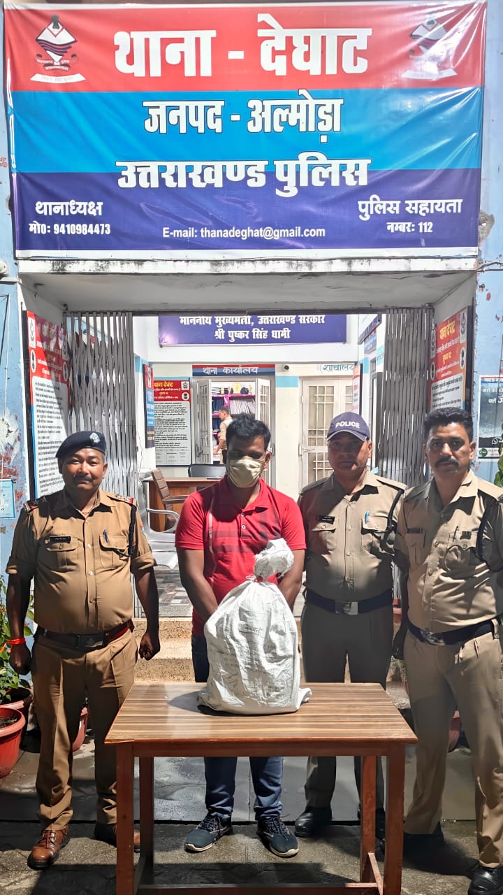 अल्मोड़ा-देवेन्द्र पींचा एसएसपी अल्मोड़ा द्वारा आगामी त्रिस्तरीय पंचायत चुनावों के दृष्टिगत समस्त थाना प्रभारियों को अवैध मादक पदार्थों की तस्करी की रोकथाम व अभियुक्तों की गिरफ्तारी हेतु सख्त निर्देश दिये गये है।जिस क्रम में अपर पुलिस अधीक्षक हरबन्स सिंह व सीओ रानीखेत विमल प्रसाद में थानाध्यक्ष देघाट दिनेश नाथ महंत के नेतृत्व में पुलिस टीम द्वारा दिनांक 14.07.2025 को चैकिंग के दौरान अभियुक्त हरीश को उसके गाँव में स्थित परचून की दुकान में शराब बेचते हुए पाया गया।उसके कब्जे से 2 पूरी व 1 आधी बोतल मैकडॉवल्स व्हिस्की तथा 8 बोतल अंग्रेज़ी शराब दिल्ली मार्का की व अन्य सामान बरामद कर गिरफ्तार करते हुए,थाना देघाट में धारा 21/60 आबकारी अधिनियम में अभियोग पंजीकृत किया गया।अभियुक्त का विवरण हरीश सिंह पुत्र कुंदन सिंह निवासी कुमालेश्वर देघाट जिला अल्मोड़ा है।पुलिस टीम में अपर उनि गणेश राणा,हे कानि मनोज पांडेय,हे कानि राजेंद्र गोस्वामी,कानि नीरज सिंह बिष्ट शामिल रहे।
