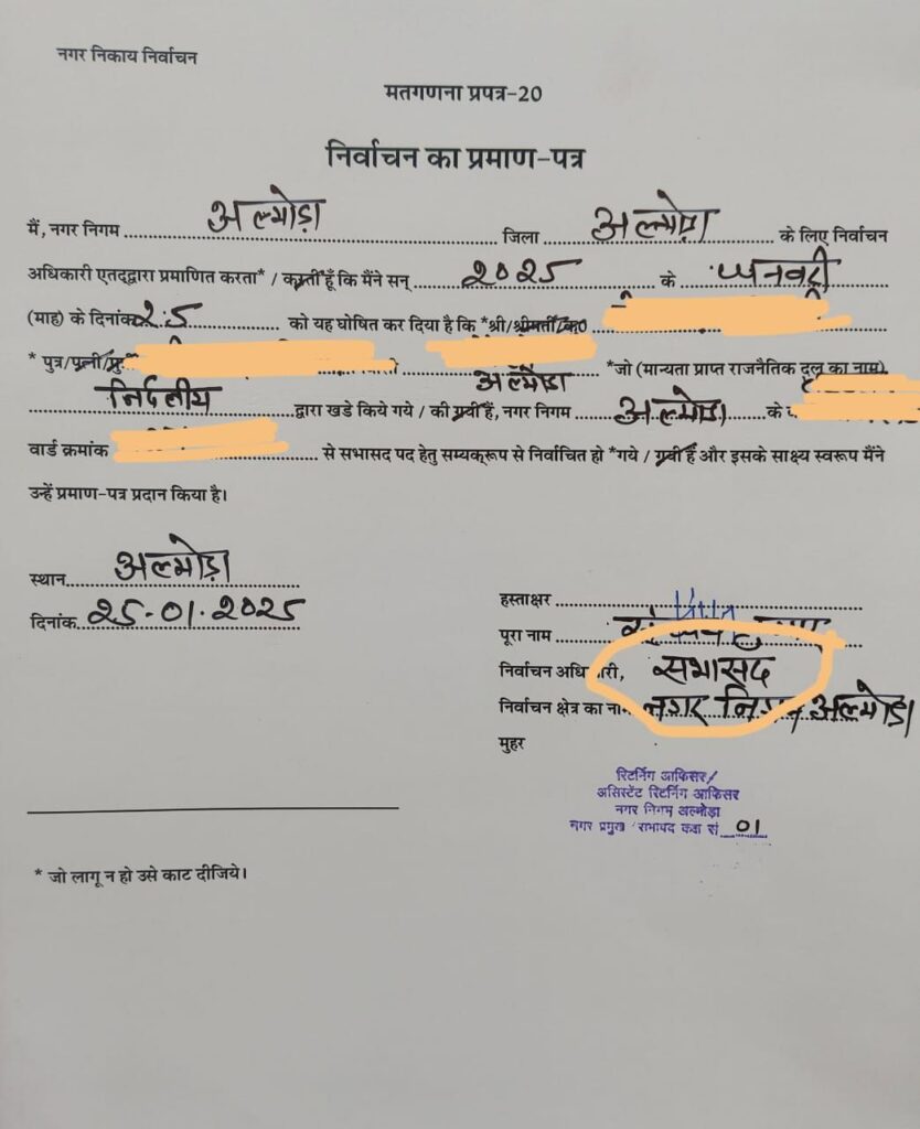 अल्मोड़ा-जिला कांग्रेस कमेटी के प्रवक्ता निर्मल रावत ने कहा है कि अल्मोड़ा नगर निगम चुनावों को पूर्ण हुए एक महीना होने को है पर विडंबना है कि नगर निगम पार्षदों को जो प्रमाण पत्र चुनाव आयोग की तरफ से मिले हैं उनमें आज भी उनके पदनाम को सभासद ही लिखा गया है.श।जिला प्रवक्ता निर्मल रावत ने कहा कि ऐसी गलती लोकतांत्रिक व्यवस्थाओं का मजाक उड़ाने के बराबर है।जब चुनाव निगम के लिए हुए हैं तो जनता द्वारा चुने हुए पार्षदों को सभासद लिखा जाना जनप्रतिनिधियों और उनको चुनने वाली जनता दोनों का अपमान है।