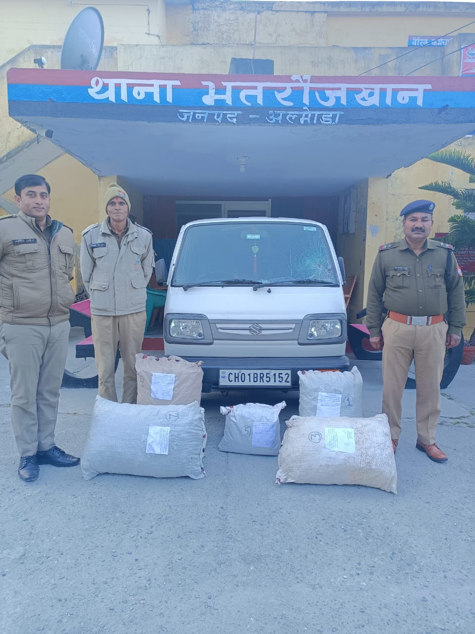 अल्मोड़ा-देवेन्द्र पींचा वरिष्ठ पुलिस अधीक्षक अल्मोड़ा द्वारा ड्रग्स फ्री देवभूमि मिशन 2025 को सफल बनाने के उद्देश्य से जनपद के सीओ, थाना/चौकी प्रभारियों एवं एसओजी/एएनटीएफ टीम को नशे के विरुद्ध लगातार अभियान चलाकर मादक पदार्थों की तस्करी/बिक्री करने वाले नशा तस्करों के विरुद्ध कड़ी कार्यवाही करने के निर्देश दिये गये हैं।सीओ अल्मोड़ा/आँपरेशन विमल प्रसाद के पर्यवेक्षण में दिनांक 16-17/01/2024 को थाना भतरौजखान पुलिस व एसओजी/एएनटीएफ टीम द्वारा संयुक्त चेकिंग के दौरान पुलिस सहायता केन्द्र मोहान पर एक मारुति वैन ( ओमिनी) नंबर- CH01BR-5152 को रोका गया तो चालक वाहन छोड़कर रात्रि में अंधेरे का फायदा उठाकर मौके से फरार हो गया है,वाहन की तलाशी लेने पर 5 कट्टों में कुल 49.548 किलोग्राम गांजा बरामद हुआ।गांजा परिवहन में प्रयुक्त वाहन मारुति वैन को सीज किया गया।उक्त बरामदगी के आधार पर थाना भतरौजखान में अज्ञात अभियुक्त के विरुद्ध एनडीपीएस अधिनियम के तहत एफआईआर पंजीकृत की गई है।अभियुक्त की तलाश/गिरफ्तारी हेतु प्रयास किये जा रहे है।बरामदगी में 49.548 किलोग्राम अवैध गांजा व गांजा परिवहन में प्रयुक्त ओमिनी मारुति वैन बरामद हुई हैं।गांजे की कीमत लगभग 7,43,220 रुपये(सात लाख तैतालीस हजार दो सौ बीस रुपये) है।पुलिस टीम में थानाध्यक्ष भतरौजखान मदन मोहन जोशी,अ0उ0नि0 राम सिंह,हे0कानि आनन्द त्रिपाठी,हे0कानि विरेन्द्र कुमार,कानि0 नीरजपाल शामिल रहे।