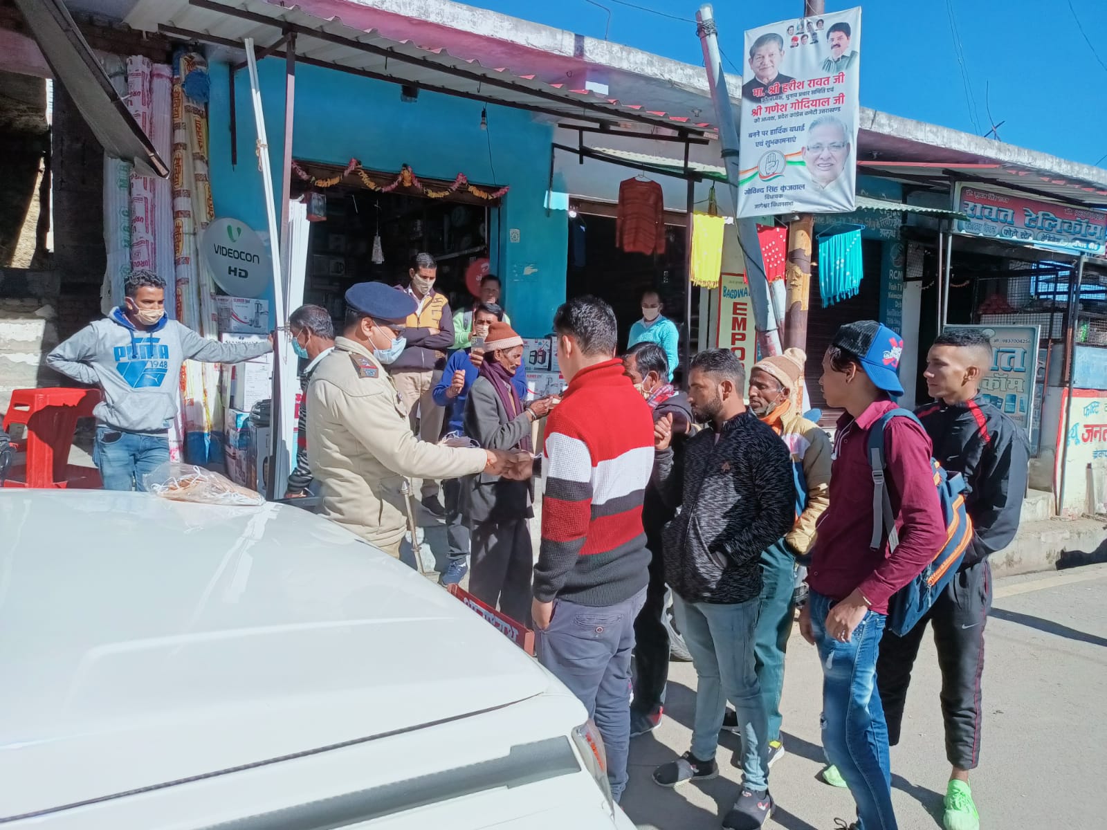 अल्मोड़ा-कोरोना वायरस एक बार फिर से फैलने लगा है,लेकिन कुछ लोग बेपरवाह होकर बिना मास्क पहने घर से निकल रहे है।अल्मोड़ा पुलिस द्वारा लोगों को मास्क वितरित कर लगातार मास्क पहनने की अपील की जा रही है।दिनांक 5.12.2021 को उ०नि० सुनील धानिक द्वारा बाजार में बिना मास्क घूम रहे लोगों को कोरोना वायरस को फिर से फैलने से बचाने के दृष्टिगत मास्क वितरित कर मास्क पहनने व सैनीटाईजर का प्रयोग करने हेतु जागरुक किया गया।