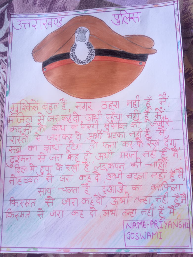 जिसमें बच्चों द्वारा काफी उत्साहित होकर बढ़-चढ़कर भाग लेकर बहुत सुंदर सुंदर चित्रों के माध्यम से मिशन हौसले को दर्शाया गया।कार्यक्रम में 52 बच्चों द्वारा प्रतिभाग किया गया। जिसमें एक नन्हे बालक उम्र 4 वर्ष प्रणव पाठक द्वारा उत्तराखंड पुलिस के बाल सिपाही के रूप में मिशन हौसले के कार्यों की सुंदर प्रस्तुति दी है।सभी प्रतिभागियों को UPWWA की जिलाध्यक्ष द्वारा सम्मानित किया जाएगा।