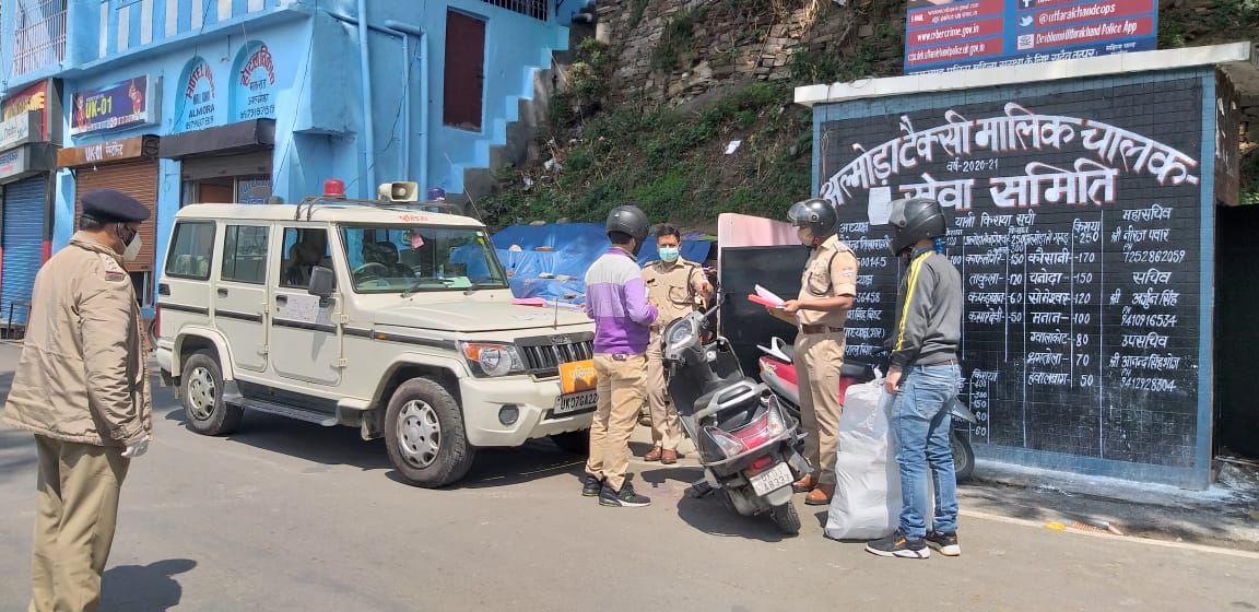अल्मोड़ा-लाकडाऊन के दौरान कोरोना के नियमों का पालन करने की पुलिस द्वारा लगातार जनता से अपील के साथ साथ नियमों का पालन ना करने वालों के विरूद्ध आवश्यक कार्यवाही भी की जा रही है।वीर सिंह पुलिस उपाधीक्षक अल्मोड़ा भी लगातार क्षेत्र का भ्रमण कर रहें है। इसी क्रम में दिनांक 12.05.2021 को पुलिस उपाधीक्षक अल्मोड़ा द्वारा क्षेत्र में भ्रमण के दौरान सामाजिक दूरी का पालन ना करने पर 4 व्यक्तियों का चालान कर संयोजन शुल्क जमा किया।