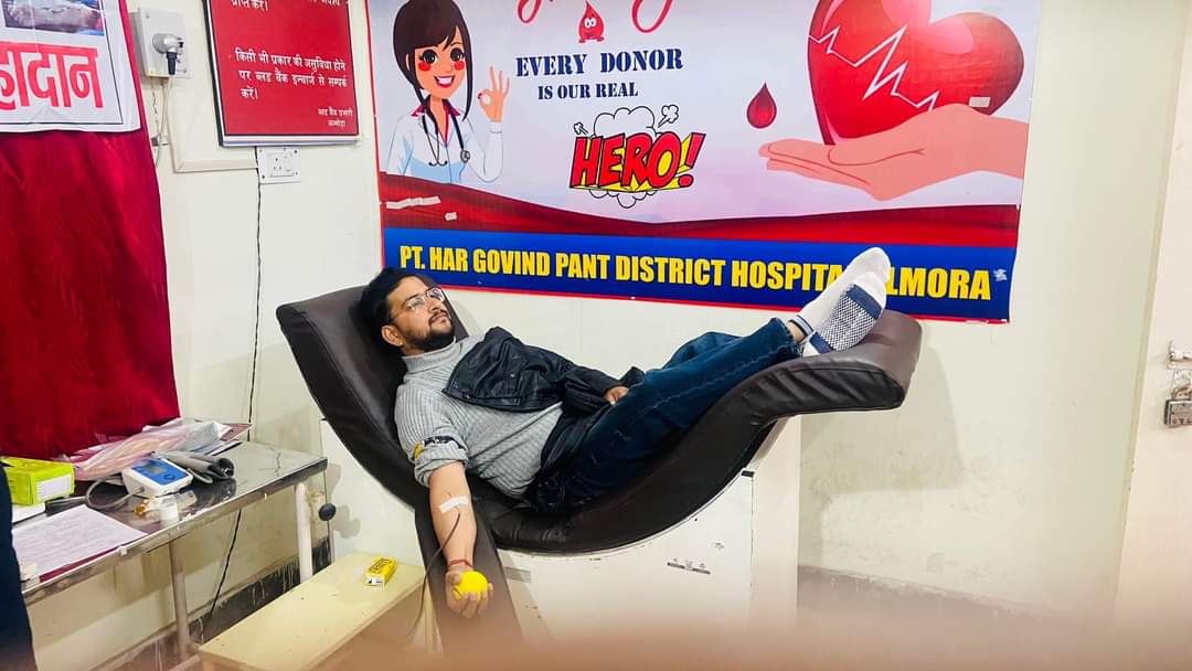 अल्मोड़ा-आज जिला चिकित्सालय अल्मोड़ा में एक आपातकालीन केस के लिए बी पाजिटिव रक्त की आवश्यकता थी।कहीं से भी बी पाजिटिव रक्त की व्यवस्था ना हो पाने से मरीज के परिजन परेशान थे।इसकी सूचना जैसे ही पूर्व छात्रसंघ उपसचिव एवं आयकर अधिवक्ता वैभव पाण्डेय को मिली वे तुरन्त जिला चिकित्सालय पहुंचे तथा रक्तदान किया। विदित हो कि वैभव पाण्डेय जनहित के कार्यों में लगातार सक्रिय रहते हैं तथा समय समय पर रक्तदान भी करते हैं। उन्होंने सभी युवाओं से भी अपील की है कि सभी अवश्य रक्तदान करें जिससे कि किसी जरूरतमंद को रक्त के लिए भटकना ना पड़े।
