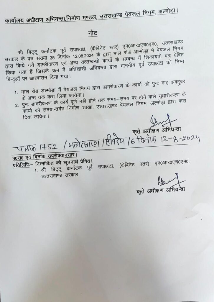 अल्मोड़ा-अल्मोड़ा की मालरोड में डामरीकरण के दो माह के भीतर ही डामर उखड़ने लगा है और सड़क पर गढ्ढे बन गये हैं, जिस पर पूर्व दर्जा मंत्री बिट्टू कर्नाटक ने गहरा रोष व्यक्त करते हुए आज अधीक्षण अभियंता जल निगम के कार्यालय में घेराव किया। पूर्व दर्जा मंत्री कर्नाटक ने दो टूक शब्दों में कहा कि जनवरी माह में माल रोड मे जाखन देवी से शिखर होटल तक सीवर लाईन निर्माण का कार्य प्रारम्भ हुआ था जिसको एक माह में पूरा हो जाना था, लेकिन कार्यदाई संस्था जल निगम के द्वारा इस कार्य को पूरा करने में पांच माह का समय लिया गया जिससे पांच माह तक पूरे क्षेत्र के व्यापारी एवं जनता परेशान रही।लगातार आन्दोलनों एवं अनेकों प्रदर्शनों के बाद सीवर का कार्य बमुश्किल पूरा हुआ। माल रोड पर डामरीकरण के लिए भी क्षेत्रीय जनता को काफी संघर्ष करना पड़ा तब जाकर सड़क पर डामरीकरण का कार्य हुआ। श्री कर्नाटक ने कहा कि हैरानी की बात है कि सड़क पर डामरीकरण हुए अभी दो माह का समय भी नहीं हुआ है और सड़क में बड़े बड़े गढ्ढे बन गये। उन्होंने कहा कि अरोमा आटोमोबाइल के सामने लगातार बड़े बड़े गढ्ढे सड़क के मध्य में बन रहे हैं जिससे उसके आसपास के भवनों को खतरा उत्पन्न हो गया है तथा वाहन चालकों एवं पैदल चलने वाले राहगीरों को भी भारी दिक्कतों का सामना करना पड़ रहा है। श्री कर्नाटक ने कहा कि माल रोड में हुए इस घटिया डामरीकरण में गुणवत्ता का बिल्कुल ध्यान नहीं रखा गया जिसके लिए स्पष्ट तौर पर कार्यदाई संस्था जल निगम जिम्मेदार है। उन्होंने कहा कि एक सप्ताह पूर्व भी जनता को हो रही परेशानी को देखते हुए उनके द्वारा सड़क के गढ्ढे सीमेंट से भरवाये गये थे, लेकिन पुनः सड़क पर सुरंगनुमा गढ्ढे बन गये हैं और कुछ जगह सड़क में बने गढ्ढों में पानी इकट्ठा होकर दुर्घटना को दावत दे रहा है। श्री कर्नाटक ने कहा कि अल्मोड़ा की जनता के साथ ये सरासर धोखा है और सरकारी धन का दुरूपयोग है। उन्होंने कहा कि सूबे के मुख्यमंत्री सड़कों को गढ्ढा मुक्त करने की बात कर रहे हैं और उनके अधिकारी सड़कों पर ऐसा डामरीकरण का कार्य कर रहे हैं, जो डामर दो माह भी नहीं टिक पा रहा है। श्री कर्नाटक ने इसके लिए जिम्मेदार जल निगम के अधिकारियों के खिलाफ कार्यवाही की मांग के साथ डामरीकरण की जांच की भी मांग की।आज घेराव और प्रदर्शन के बाद जल निगम के अधिकारियों ने आनन फानन में पूर्व दर्जा मंत्री की सभी बातें मानी और लिखित रूप में आश्वासन दिया कि बरसात समाप्त होते ही अक्टूबर में सड़क पर पुनः हाट मिक्स का कार्य किया जाएगा तथा सड़क के गढ्ढों को तत्काल भरा जाएगा।इसके साथ ही डामरीकरण की थर्ड पार्टी जांच भी की जाएगी।इसके बाद पूर्व दर्जा मंत्री कर्नाटक ने लिखित प्रपत्र लेकर अपना कार्यक्रम समाप