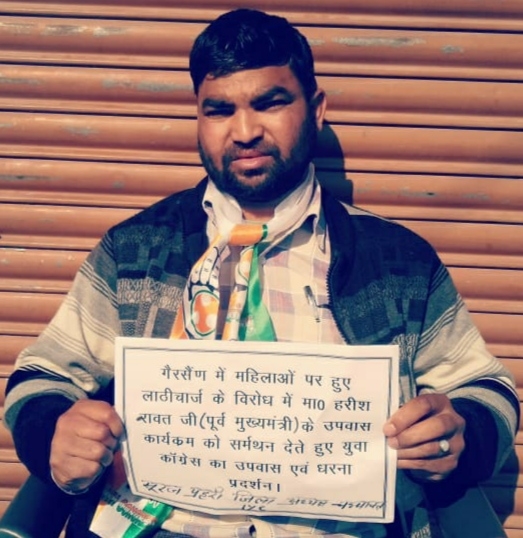 चम्पावत-गैरसैण में महिलाओं पर हुए लाठीचार्ज के विरोध में हरीश रावत राष्ट्रीय महासचिव एवं पूर्व मुख्यमंत्री के उपवास कार्यक्रम को बुद्ववार को सूरज प्रहरी जिला अध्यक्ष युवा कांग्रेस चम्पावत ने समर्थन देते हुए सेवायोजन कार्यालय के समीप अपने आवास पर एक घंटे का उपवास/धरना प्रदर्शन कर समर्थन दिया।उन्होंने कहा कि चमोली जिले के स्थानीय ग्रामीण वर्षों से लम्बित घाट-नन्दप्रयाग,डेढ़ लेन चौड़ीकरण की मांग को लेकर विगत वर्षों से धरने पर थे।परंतु एक मार्च को विधानसभा सत्र के पहले दिन भारी संख्या में महिलाएं,पुरुष एवं युवा सड़क की मांग को लेकर शांतिपूर्ण विरोध प्रदर्शन कर भराड़ीसैड़ स्थित विधानसभा की ओर कूच कर रहे थे। परंतु त्रिवेंद्र सरकार के इशारे पर पुलिस द्वारा उक्त प्रदर्शनकारियों को द्वारीखाल में ही रोककर प्रदर्शनकारियों पर पानी की बौछार कर दी गयी साथ ही लाठीचार्ज भी किया गया।जिससे कई महिलाऐं एवं पुरुष, युवा घायल हुए।सरकार के इशारे पर पुलिस द्वारा की गई बर्बरता पूर्वक लाठीचार्ज से समूचा उत्तराखण्ड शर्मशार हो गया है।उन्होंने कहा कि त्रिवेंद्र सरकार के इशारे पर प्रदर्शनकारियों पर हुए लाठीचार्ज ने 1994 के उत्तराखण्ड राज्य बनाओ आंदोलन के मुजफ्फरनगर कांड की याद दिला कर उत्तराखण्ड वासियों का अपमान किया है,।जिसे उत्तराखण्ड की जनता कभी माफ नहीं करेगी तथा इसका जवाब 2022 में भाजपा को सत्ता से बाहर कर दिया जाएगा।