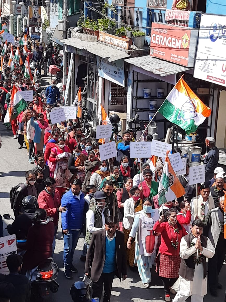 अल्मोड़ा-आज अल्मोड़ा के पूर्व विधायक मनोज तिवारी के नेतृत्व में अल्मोड़ा के कांंग्रेसजनों ने बेतहाशा बढ़ रही महंगाई एवं बेरोजगारी के विरोध में अल्मोड़ा बाजार में विशाल जूलूस निकालकर केन्द्र एवं राज्य की भाजपा सरकार के खिलाफ प्रदर्शन किया।अपने पूर्व घोषित कार्यक्रम के अनुसार कांंग्रेसजन आज दोपहर 12 बजे पूर्व विधायक मनोज तिवारी के नेतृत्व में गांधी पार्क में एकत्रित हुए तथा केन्द्र/राज्य की भाजपा सरकार के खिलाफ जोरदार प्रदर्शन किया।इस अवसर पर पूर्व विधायक मनोज तिवारी ने कहा कि लगातार पेट्रोल, डीजल,रसोई गैस सहित दैनिक उपभोग की प्रत्येक वस्तुओं के दाम बढ़ रहे हैं जिससे जनता त्रस्त है।उन्होंने सत्तासीन भाजपा सरकार पर आरोप लगाते हुए कहा कि सरकार महंगाई पर अंकुश लगाने में पूरी तरह असफल साबित रही है जिसका परिणाम है कि आज पेट्रोल, डीजल और गैस के मूल्य अपनी शीर्ष पर हैं।जिलाध्यक्ष पीताम्बर पान्डेय ने कहा कि लगातार पेट्रोल,डीजल एवं घरेलू गैस की कीमतों में केन्द्र सरकार द्वारा की जा रही बढ़ोत्तरी से स्पष्ट होता है कि यह सरकार गरीब विरोधी है।इस सरकार में युवाओं के लिए रोजगार नहीं है।जूलूस में पूर्व विधायक के साथ सैकड़ों की संख्या में उनके समर्थक तथा कांंग्रेसजन शामिल रहे।प्रदर्शन तथा जुलूस में पूर्व विधायक मनोज तिवारी, जिलाध्यक्ष पीताम्बर पान्डेय,नगर अध्यक्ष पूरन सिंह रौतेला, नगरपालिका अध्यक्ष प्रकाश चन्द्र जोशी,महिला जिलाध्यक्ष लता तिवारी,महिला नगर अध्यक्ष गीता मेहरा,यूथ जिलाध्यक्ष निर्मल रावत,वरिष्ठ उपाध्यक्ष तारा चन्द्र जोशी,यूथ प्रदेश प्रवक्ता वैभव पान्डेय,भूपेन्द्र भोज,हर्ष कनवाल, धीरेन्द्र गैलाकोटी, ब्लाक अध्यक्ष राजेन्द्र बोरा,कार्तिक साह,जिला प्रवक्ता राजीव कर्नाटक,जिला सचिव दीपांशु पाण्डेय,जिला पंचायत सदस्य बल्टा महेन्द्र बिष्ट,जिला पंचायत सदस्य देवेन्द्र बिष्ट डिम्पल,विनोद वैष्णव, तारू तिवारी,सभाषद सचिन आर्या,सभाषद हेम तिवारी,प्रमोद पवार भीमा,पूर्व सभाषद मुकेश नेगी,पूर्व सभाषद हेम तिवारी,ललित सतवाल, राबिन मनोज भण्डारी,क्षेत्र पंचायत सदस्य शेखर पान्डेय,जिला उपाध्यक्ष पारितोष जोशी,नगर प्रवक्ता पंकज कान्डपाल,प्रदेश ध्वजवाहक संजय दुर्गापाल,अख्तर हुसैन,फाकिर खान,रोहित रौतेला,प्रीति बिष्ट, राधा बिष्ट,मंजू कान्डपाल,लीला जोशी,दीपा त्रिपाठी,गोपाल चौहान,जगदीश लटवाल, सुन्दर बिष्ट, फहीमुद्दीन,गीता आर्या,धीरा तिवारी,तारा तिवारी,हेमा तिवारी,कमला पान्डेय,ज्योति,हेमा तिवारी,माया गैड़ा,निशा तिवारी,रमा लोहनी,मुन्नी पन्त,रजनी टम्टा,गीता बिष्ट,रश्मि खोलिया,ज्योति बिष्ट, विद्या आर्या,पूनम आर्या,राधा तिवारी,ममता तिवारी, सरस्वती आर्या,दीपा भण्ड