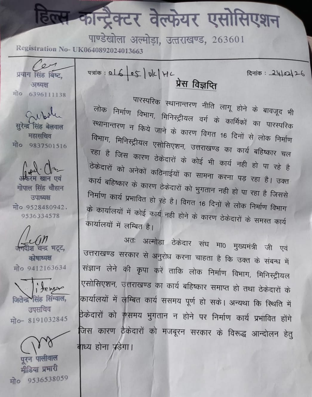 अल्मोड़ा- लोक निर्माण विभाग के मिनिस्ट्रीयल कर्मचारियों के कार्य बहिष्कार से जिले के ठेकेदारों की परेशानी बढ़ गई है। ठेकेदारों ने मुख्यमंत्री और राज्य सरकार से इस मामले में हस्तक्षेप कर जल्द समाधान निकालने की मांग की है। हिल्स कॉन्ट्रैक्टर वेलफेयर एसोसिएशन की ओर से जारी पत्र में कहा गया है कि पारस्परिक स्थानांतरण नीति लागू होने के बावजूद विभाग के मिनिस्ट्रीयल कर्मचारियों का स्थानांतरण नहीं किया जा रहा है। इसी के विरोध में उत्तराखंड मिनिस्ट्रीयल एसोसिएशन पिछले 16 दिनों से कार्य बहिष्कार पर है, जिससे विभागीय कार्य पूरी तरह प्रभावित हो गए हैं। एसोसिएशन के अनुसार कार्य बहिष्कार के कारण ठेकेदारों के भुगतान लंबित हैं और निर्माण कार्य बाधित हो रहे हैं। विभागीय कार्यालयों में कामकाज ठप होने से फाइलें अटकी हुई हैं और ठेकेदारों को आर्थिक दिक्कतों का सामना करना पड़ रहा है। ठेकेदारों ने सरकार से जल्द हस्तक्षेप कर कर्मचारियों की समस्याओं का समाधान कराने की मांग की है, ताकि कार्य बहिष्कार समाप्त हो और निर्माण कार्य समय पर पूरे हो सकें। उन्होंने चेतावनी दी है कि यदि शीघ्र समाधान नहीं निकाला गया तो भुगतान में देरी के चलते निर्माण कार्य प्रभावित होंगे और ठेकेदार आंदोलन के लिए बाध्य हो सकते हैं। पत्र पर एसोसिएशन के अध्यक्ष प्रयाग सिंह बिष्ट, महासचिव सुरेंद्र सिंह बेलवाल, उपाध्यक्ष अकरम खान, गोपाल सिंह चौहान, कोषाध्यक्ष जगदीश चंद्र भट्ट, उपसचिव जितेंद्र सिंह सिंग्वाल और पूरन पालीवाल के हस्ताक्षर हैं।