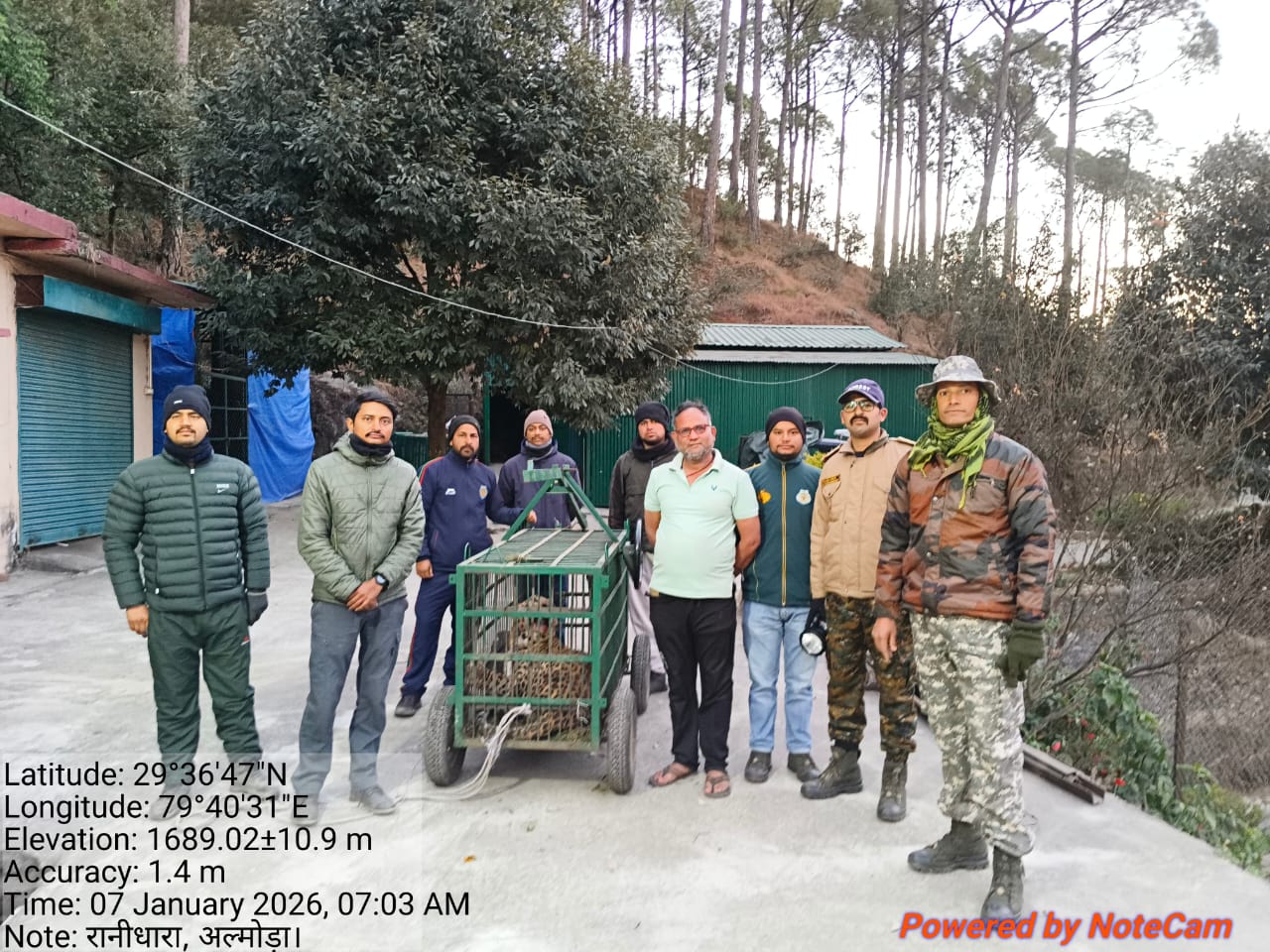 अल्मोड़ा-नगर के रानीधारा में पिछले लंबे समय से रात्रि के समय सड़कों पर गुलदार दिखाई देने से आतंक का माहौल बना हुआ था।पिछले दिनों वन विभाग के द्वारा वहां पर पिंजड़ा लगाया गया था जिसमें विगत रात्रि तेंदुआ फंस गया।आज सुबह वन विभाग की टीम के द्वारा उसे रेस्क्यू सेंटर ले जाया गया।वन विभाग की टीम में अमित सिंह भैसोड़ा अनुभाग अधिकारी,सत्येंद्र सिंह नेगी,वन दरोगा भास्कर नाथ महंत,वन दरोगा ऋषभ सेमवाल,वन दरोगा विवेकतिवारी,वन बीट अधिकारी राहुल मनराल,वन बीट अधिकारी प्रकाश कुमार,वन बीट अधिकारी नीरज नेगी, क्यूं आर टी सदस्य मनोज जोशी शामिल रहे।
