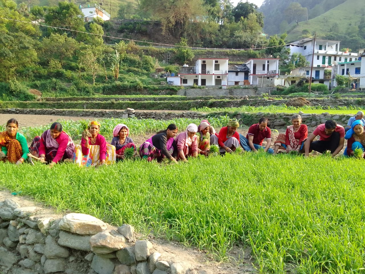 अल्मोड़ा -रीठागाड पट्टी के मंगलता सेरा में महिलाओं के झुंड के द्वारा रोपाई हो रही है।ये मंगलता गांव में महिलाओं के समूह के द्वारा हर साल रोपाई व गुडाई एक झुंड में होती रहती है।हर परिवार की महिलाऐं एकत्रित होकर एक दूसरे के खेतों में रोपाई के समय सहयोग करती आ रही है। मंगलता सेरा की महिलाओं की एकता बहुत अच्छी है।इससे पूर्व में इन महिलाओं के समूह के द्वारा श्रमदान करके दो ढाई किलोमीटर गूल के लिए जैगन नदी में सेतू बनाकर पानी पहुंचाया गया था।प्रताप सिंह नेगी समाजिक कार्यकर्ता ने बताया ये महिलाएं रुपाई,गुड़ाई व अन्य देवी देवताओं के अनुष्ठान में भी एकत्रित होकर अपना प्रतिभाग करती रहती है। नेगी इन महिलाओं की प्रसंशा करते हूए बताया कि ऐसे ही और भी महिलाओं को अपने समूह के द्वारा एक दूसरे को सुख दुःख में मदद करनी चाहिए जैसे मंगलता गांव की महिलाओं के द्वारा रुपाई गुड़ाई में एक दूसरे के खेतों में झुंड बनाकर मदद करने का सिलसिला कई वर्षों से चले आ रहा है।इस रुपाई में अलग-अलग परिवार की महिलाऐं हेमा देवी,जानकी देवी,राधिका देवी,शान्ति देवी,प्रेमा देवी,कमला देवी,कलावती देवी,दया देवी,किरन देवी,पार्वती देवी,नीमा देवी,रमा देवी आदि महिलाएं मौजूद रही।