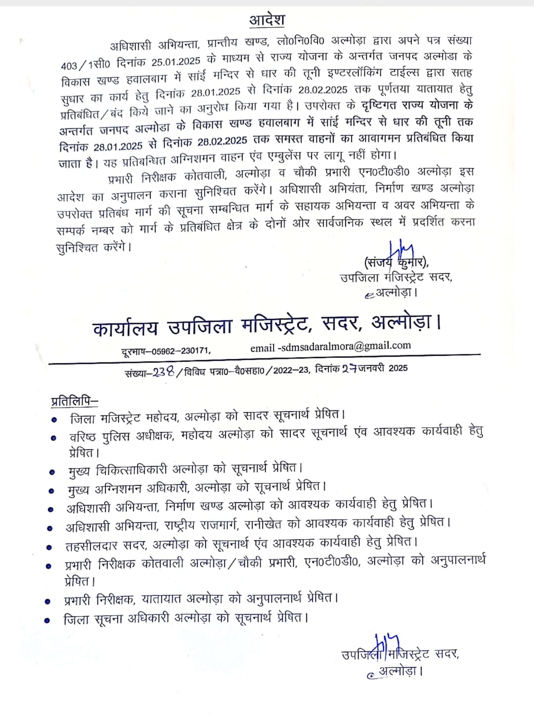 अल्मोड़ा-अधिशासी अभियन्ता प्रान्तीय खण्ड लो०नि०वि० अल्मोड़ा द्वारा अपने पत्र संख्या 403/1सी0 दिनांक 25.01.2025 के माध्यम से राज्य योजना के अन्तर्गत जनपद अल्मोडा के विकास खण्ड हवालबाग में सांई मन्दिर से धार की तूनी इण्टरलॉकिंग टाईल्स द्वारा सतह सुधार के कार्य हेतु दिनांक 28.01.2025 से दिनांक 28.02.2025 तक पूर्णतया यातायात हेतु प्रतिबंधित / बंद किये जाने का अनुरोध किया गया है। उपरोक्त के दृष्टिगत राज्य योजना के अन्तर्गत जनपद अल्मोडा के विकास खण्ड हवालबाग में सांई मन्दिर से धार की तूनी तक दिनांक 28.01.2025 से दिनांक 28.02.2025 तक समस्त वाहनों का आवागमन प्रतिबंधित किया जाता है।यह प्रतिबन्ध अग्निशमन वाहन एवं एम्बुलेंस पर लागू नहीं होगा।प्रभारी निरीक्षक कोतवाली,अल्मोड़ा व चौकी प्रभारी एन०टी०डी० अल्मोड़ा इस आदेश का अनुपालन कराना सुनिश्चित करेंगे।अधिशासी अभियंता निर्माण खण्ड अल्मोड़ा उपरोक्त प्रतिबंध मार्ग की सूचना सम्बन्धित मार्ग के सहायक अभियन्ता व अवर अभियन्ता के सम्पर्क नम्बर को मार्ग के प्रतिबंधित क्षेत्र के दोनों ओर सार्वजनिक स्थल में प्रदर्शित करना सुनिश्चित करेंगे।उपजिला मजिस्ट्रेट सदर ने इस हेतु आदेश जारी किये हैं।