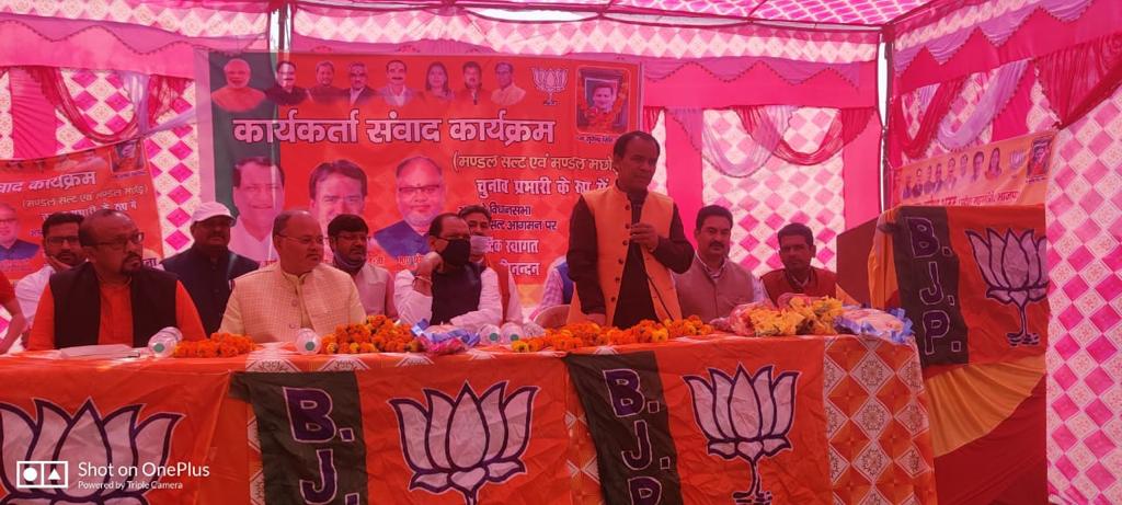 अल्मोड़ा-सुरेन्द्र सिंह जीना के निधन से खाली हुई सल्ट सीट के लिए भाजपा जिला इकाई के साथ प्रदेश संगठन द्वारा तैयारियों को मद्देनजर रखते हुए पोखरी में कार्यकर्ता संवाद कार्यक्रम आयोजित किया गया।इस बैठक में प्रदेश के काबीना मंत्री यशपाल आर्या,राज्यमंत्री स्वतंत्र प्रभार धन सिंह रावत,प्रदेश महामंत्री सुरेश भट्ट द्वारा शिरकत की गई और मंत्रीद्धय एवं प्रदेश महामंत्री ने कार्यकर्ताओं का आह्वान किया कि वे सल्ट विधानसभा के घर-घर जाकर जनसम्पर्क अभियान को तेज कर दें।इस अवसर पर जिला इकाई एवं कार्यकर्ताओं द्वारा मंत्रीद्वय एवं प्रदेश महामंत्री का अभूतपूर्व स्वागत किया। इस अवसर पर बोलते हुए सभी वक्ताओं ने कहा कि प्रदेश की जनता भाजपा की सबका साथ सबका विश्वास की नीति एवं विकास कार्यों से पूर्णतः सन्तुष्ट है और सल्ट सीट एक बार पुनः भाजपा की झोली में आयेगी और वह भी काफी अन्तर से।उन्होंने कहा कि कांग्रेस के नेताओं के अंतरदव्नन्द से उनकी छीछालेदर हो रही है और कांग्रेस मुक्त भारत को सल्ट की जनता अपना भरपूर समर्थन देगी।इस अवसर पर जिलाध्यक्ष रवि रौतेला ने कहा कि पार्टी का प्रदेश नेतृत्व जिसको भी टिकट देगा पार्टी कार्यकर्ता पूरी तन्मयता से उसे जिताने के लिए दिन-रात एक कर देंगे और जनता का आह्वान किया कि सल्ट विधानसभा के चुनाव में कमल के निशान का बटन दबाकर भाजपा प्रत्याशी भारी मतों से विजयी बनायें।इस अवसर पर दर्जा राज्यमंत्री दिनेश महरा,स्व० सुरेन्द्र सिंह जीना के बड़े भाई महेश जीना,डा० यशपाल रावत, महेश्वर मेहरा,नरेन्द्र भण्डारी,गिरीश कोटनाला,जिला महामंत्री प्रेम शर्मा, जिला उपाध्यक्ष गिरीश सत्यवली, जिला महामंत्री अनंसूचित मोर्चा हरी राम,मण्डल अध्यक्ष विक्रम बिष्ट,हरीश कोटिया,जिला महामंत्री महिला मोर्चा मंजू रावत,जिला मंत्री महिला मोर्चा पिंकी करगेती,मोहित नेगी,क्षेत्र पंचायत सदस्य सादर सिंह,हंसा नेगी, श्याम प्रसाद,केसर सिंह सहित सैकड़ों कार्यकर्ताओं ने मंत्रियों एवं प्रदेश महामंत्री का स्वागत किया।