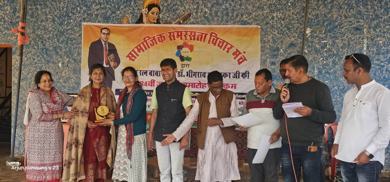 अल्मोड़ा-सामाजिक समरसता विचार मंच द्वारा अल्मोड़ा महानगर में प्रथम बार भारतरत्न बाबा साहेब डा. भीमराव अम्बेडकर की 134 वीं जयन्ती पर प्रातः 10 बजे सिद्वनॊला मंदिर से संकल्प यात्रा एंव झाँकी का शुभारंभ समाजसेवी महिला कल्याण संस्था की अध्यक्ष रीता दुर्गापाल द्वारा शुभारंभ करते हुए सामाजिक समरसता विचार मंच के समरसता के भाव को मजबूत करने के प्रयासों की सराहना करी। इस अवसर पर संकल्प यात्रा में पूर्व विधानसभा उपाध्यक्ष रघुनाथ सिंह चौहान,निर्वतमान जिला सहकारी बैंक अध्यक्ष ललित लटवाल, भाजपा महानगर अध्यक्ष विनीत बिष्ट, पूर्व दर्जा मंत्री सिकंदर पवार,रमेश लाल,गोपाल राम,जोगेन्द्र प्रसाद, पीयूष कुमार,प्रकाश भट्ट,देवेन्द्र भट्ट , नमित जोशी,जगत तिवारी,वीरेन्द्र, राहुल कुमार,आशीष जोशी,दीप चन्द्र जोशी,दिनेश मठपाल,विनोद गिरी गोस्वामी,राजिक अली अंसारी,यात्रा संयोजक किशन लाल सहित अनेक लोग मौजूद थे।संकल्प यात्रा का संचालन मंच सचिव त्रिलोचन जोशी ने किया।संकल्प यात्रा सिद्वनौला मंदिर से नन्दादेवी मंदिर परिसर तक निकाली गयी।संकल्प यात्रा में स्कूली बच्चों द्वारा देशभक्ति के गीत और डा. अम्बेडकर के जयकारे लगाये।नगर व्यापार मण्डल अध्यक्ष अजय वर्मा द्वारा संकल्प यात्रा का सूक्ष्म जलपान का आयोजन करके स्वागत किया।मुख्य कार्यक्रम जयन्ती समारोह का गीता भवन में आयोजित किया गया। कार्यक्रम के मुख्य अतिथि वरिष्ठ पुलिस अधीक्षक देवेन्द्र पींचा, कार्यक्रम अध्यक्ष महापौर अजय वर्मा एवं विशिष्ट अतिथि रंगकर्मी रमेश लाल द्वारा दीप प्रज्ज्वलित करके समारोह का शुभारंभ किया।मंच के सचिव त्रिलोचन जोशी एंव अन्य सदस्यों द्वारा अतिथियों को प्रतीक चिन्ह एंव अंगवस्त्र देकर सम्मानित किया।समारोह में सांस्कृतिक दलों द्वारा छोलिया नृत्य एवं देशभक्ति के गीतों एंव नृत्य प्रस्तुत किये वहीं स्कूली बच्चों द्वारा वंदना एंव देशभक्ति के गीत और डा. अम्बेडकर के जीवन पर नाटक प्रस्तुत किये।कार्यक्रम में मुख्य अतिथि वरिष्ठ पुलिस अधीक्षक देवेन्द्र पींचा ने बाबासाहेब को संविधान का जनक बताते हुए युग पुरूष की संज्ञा देते हुए महान समाज सुधारक बताया।उन्होंने कहा कि बाबा साहेब के जीवन से प्रेरणा लेकर देश को मजबूत बनाने का सबको संकल्प लेना चाहिए।उन्होने मंच की सराहना करते हुए प्रयासों को समरसता के दिशा में मजबूत कदम बताया।समारोह में विभिन्न क्षेत्रों में कार्य करने वाले महानुभावों को सम्मानित किया। जिनमें चिकित्सा के क्षेत्र में डा. ऊषा उप्रेती, शिक्षा के क्षेत्र में हेमलता वर्मा, खेल के क्षेत्र में रितिक राज, संस्कृति के क्षेत्र में रमेश लाल, हस्तशिल्प के क्षेत्र में सुरेश टम्टा, कला के क्षेत्र में सु