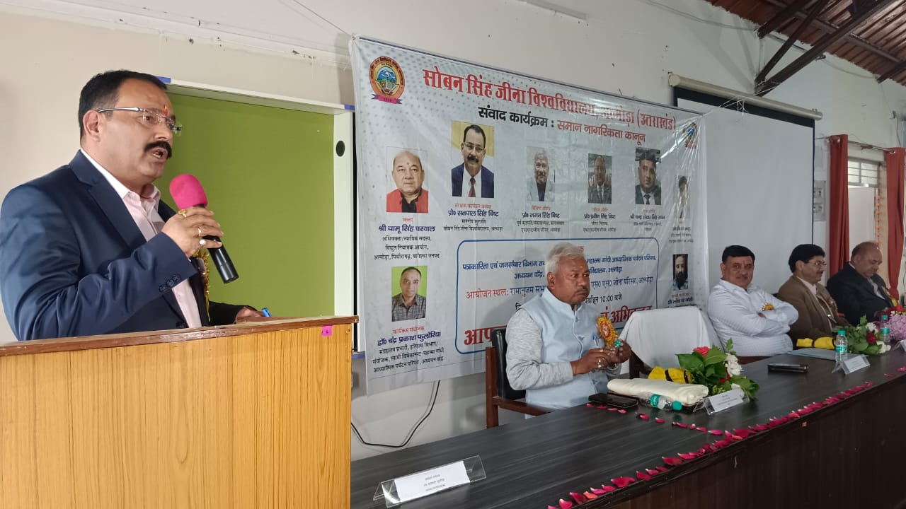 अल्मोड़ा-सोबन सिंह जीना विश्वविद्यालय अल्मोड़ा द्वारा आज गणित विभाग में समान नागरिक संहिता विषय पर एकदिवसीय संवाद कार्यक्रम का शुभारंभ हुआ।कार्यक्रम के संरक्षक एवं अध्यक्ष रूप में विश्वविद्यालय के कुलपति प्रोफेसर सतपाल सिंह बिष्ट,मुख्य अतिथि रूप में मुख्य स्थाई अधिवक्ता उच्च न्यायालय चंद्रशेखर सिंह रावत, विशिष्ट अतिथि रूप में पूर्व कुलपति एवं संकाय अध्यक्ष,कला संकाय प्रोफेसर जगत सिंह बिष्ट,कार्यक्रम के वक्ता चामू सिंह घस्याल (अधिवक्ता न्यायिक सदस्य विद्युत नियामक आयोग अल्मोड़ा,पिथौरागढ़,बागेश्वर जनपद,वक्ता के रूप में विधि संकाय के आचार्य प्रोफेसर डी.के.भट्ट, कुलसचिव डॉ.देवेंद्र सिंह बिष्ट, आयोजन के संयोजक डॉ चंद्र प्रकाश फुलोरिया,सहसंयोजक पत्रकारिता एवं जनसंचार विभाग के डॉक्टर ललित चंद्र जोशी ने द्वीप प्रज्ज्वलित कार्यक्रम का उद्घाटन किया।संयोजक डॉ चंद्र प्रकाश फुलोरिया ने बताया कि इस कार्यक्रम में विधि विशेषज्ञों एवं विद्वानों द्वारा समान नागरिक संहिता विषय पर मंथन करने के साथ विद्यार्थियों से संवाद किया गया। उन्होंने कार्यक्रम की रूपरेखा प्रस्तुत की।कार्यक्रम के वक्ता चामू सिंह घस्याल अधिवक्ता न्यायिक सदस्य विद्युत नियामक आयोग अल्मोड़ा पिथौरागढ़, बागेश्वर जनपद ने कहा कि समान नागरिकता कानून को लागू करने वाला देश का पहला राज्य उत्तराखंड है।यह कानून सभी वर्ग, सभी जाति,सभी धर्म के लिए समानता की बात करता है।उन्होंने विवाह,उत्तराधिकार,भरण पोषण, सामाजिक सौहार्द आदि को लेकर इस कानून में समाहित विषयों की चर्चा की।वक्ता रूप में विधि संकाय के आचार्य प्रोफेसर डी.के. भट्ट ने कहा कि उत्तराखंड में समान नागरिकता कानून सभी जनमानस को ध्यान में रखते हुए किया गया है।उन्होंने कहा कि विवाह से संबंधित विभिन्न प्रावधान जो पहले किसी न किसी रूप में संदेह के घेरे में थे उन सब को अब एक पैमाने से तोलने का जो अवसर मिला है वह समान नागरिकता कानून की एक बहुत बड़ी देन है। उन्होंने लिव इन रिलेशन से संबंधित प्रावधानों को भी उजागर किया और कहा कि लिव इन रिलेशन में यदि कोई भी जोड़ा अवैध रूप से रह रहा है तो उसके पुत्र को तो मान्यता मिल जाएगी लेकिन यदि उन्होंने समय पर रजिस्ट्रेशन नहीं कराया तो पति पत्नी के रूप में उनकी वैधता अवैध मानी जाएगी।मुख्य अतिथि रूप में मुख्य स्थाई अधिवक्ता उच्च न्यायालय के अधिवक्ता चंद्रशेखर सिंह रावत ने कहा कि समान नागरिकता कानून उत्तराखंड के द्वारा लागू किया गया है और यह देश का पहला राज्य है जिसने इसको कार्य रूप में परिणित किया है।समान नागरिकता कानून के विभिन्न प्रावधानों के बारे में उन्होंने जानकारी देते हुए कहा कि इस कानून के प्रभावी होने के ब