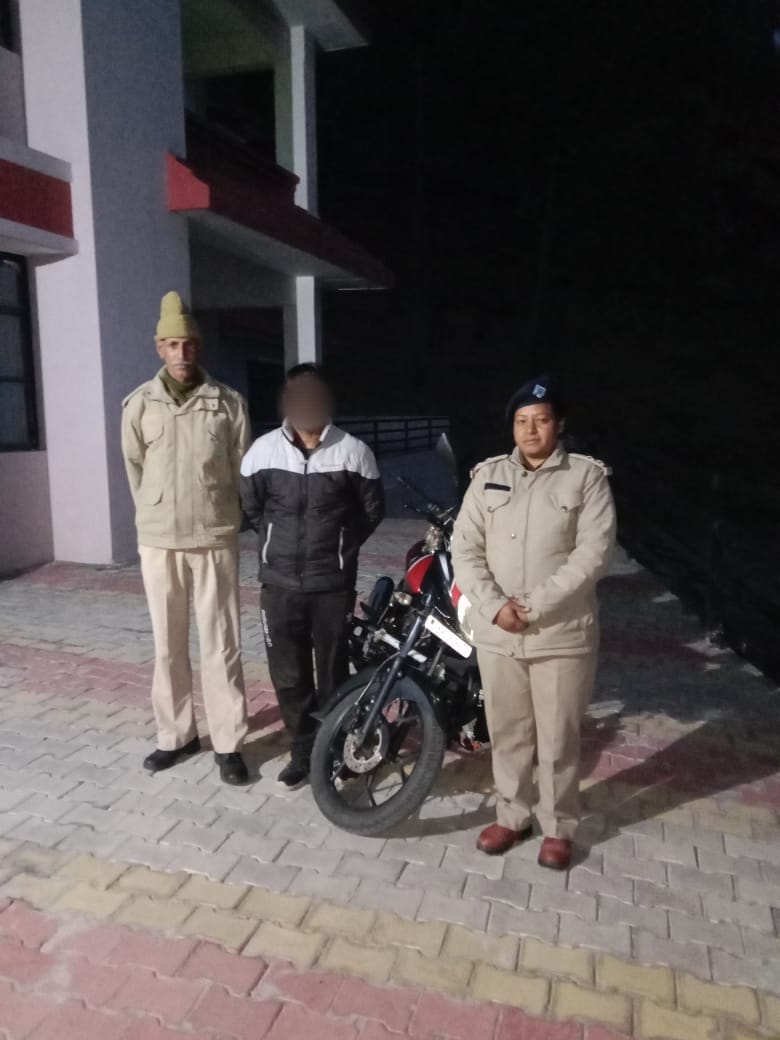 अल्मोड़ा-श्रीमती रचिता जुयाल एसएसपी अल्मोड़ा द्वारा जनपद के समस्त थाना/चौकी प्रभारियों,निरीक्षक/उ0नि0 यातायात व इण्टर सेप्टर प्रभारी को सड़क दुर्घटनाओं की रोकथाम हेतु शराब पीकर वाहन चलाने,ओवर स्पीड/रैश ड्राइविंग व ओवर सवारी/ओवरलोडिंग करने वाले वाहन चालकों के विरुद्ध कड़ी कार्यवाही के निर्देश दिये गये है।दिनांक 04.04.2023 को थाना दन्या पुलिस द्वारा चेकिंग के दौरान वाहन संख्या- UA- 01 B- 8254 मोटर साईकिल को चैक करने पर बाईक चालक भुवन राम निवासी मनी आगर,थाना धौलछीना, जनपद अल्मोड़ा शराब के नशे में वाहन चलाता पाया गया,चालक का सामुदायिक स्वास्थ्य केंद्र धौलादेवी में मेडिकल परीक्षण कराने पर शराब पीने की पुष्टि हुई जिस पर वाहन चालक को मोटर वाहन अधिनियम के तहत गिरफ्तार कर वाहन मो0सा0 की सीज किया गया।
