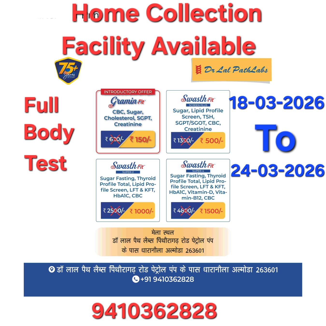 अल्मोड़ा-शहर में डॉ. लाल पैथ लैब्स धारानौला की ओर से 18 मार्च से 24 मार्च तक स्वास्थ्य मेले का आयोजन किया जाएगा, जिसमें फुल बॉडी चेकअप और विभिन्न रक्त जांचों पर विशेष छूट दी जाएगी। आयोजकों के अनुसार शिविर में विशेष पैकेज में फुल बॉडी चेकअप की सुविधा उपलब्ध कराई जाएगी। विशेष पैकेज में लीवर, किडनी, थायरॉइड, कोलेस्ट्रॉल, शुगर, सीबीसी, HbA1c, विटामिन-डी, विटामिन-बी12, यूरिक एसिड और कैल्शियम सहित कई महत्वपूर्ण जांचें सस्ती दरों पर जांच की जाएगी, जिनकी सामान्य बाजार कीमत काफी अधिक है। स्वास्थ्य मेले के दौरान इच्छुक लोग सुबह 7:30 बजे से निर्धारित अवधि तक जांच करा सकेंगे। इसके लिए नागरिक धारानौला स्थित लैब (पेट्रोल पंप के पास) में संपर्क कर सकते हैं। मरीजों की सुविधा के लिए घर से सैंपल लेने की सुविधा भी उपलब्ध कराई गई है। आयोजकों ने लोगों से इस अवसर का लाभ उठाकर समय रहते स्वास्थ्य जांच कराने की अपील की है।