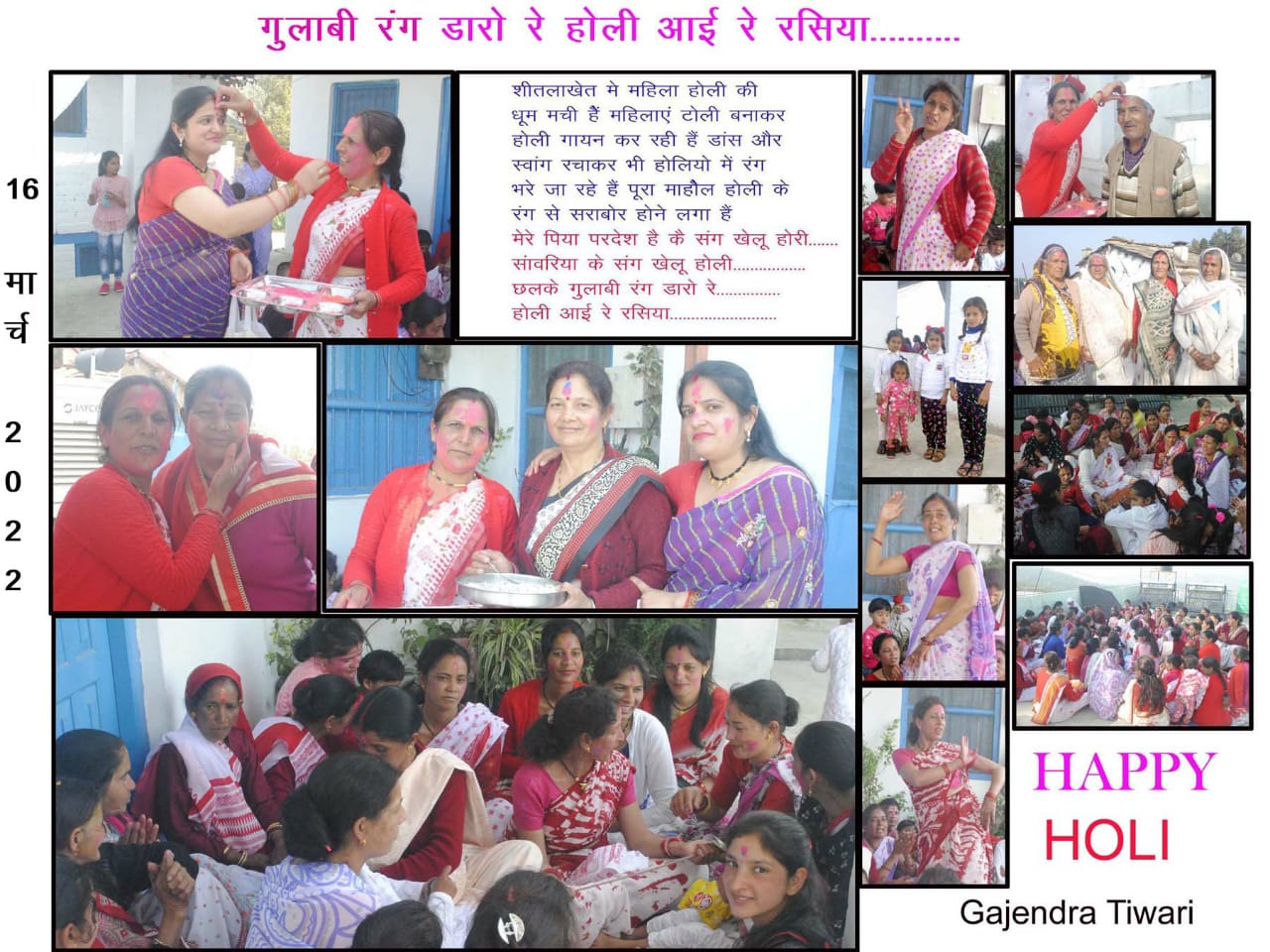 अल्मोड़ा-शीतलाखेत अल्मोड़ा ग्राम सभा सल्ला रौतेला में महिला होली का आयोजन किया जा रहा है।आज शीतला खेत बाजार क्षेत्र में आयोजन किया गया।होली के अवसर पर सरपंच सल्ला रौतेला पंकज पाठक व स्थानीय निवासी गणेश पाठक,नन्नू पाठक, शंकर दत्त पाठक व उत्तरांचल फैडरेशन ऑफ मिनिस्टीरियल सर्विसेज एसोसिएशन कुमाऊं मण्डल नैनीताल के अध्यक्ष व उत्तरांचल पर्वतीय कर्मचारी शिक्षक संगठन के प्रदेश उपाध्यक्ष धीरेन्द्र कुमार पाठक के आवास पर भी महिला होली का आयोजन किया गया।सभी उपस्थित महिलाओं ने होली के पुराने व नये गीत गाए।सभी ने एक दूसरे को रंग व अबीर गुलाल लगाया।छलड़ी से पूर्व तक सभी महिलाओं द्वारा घर घर महिला होली मनाई जाती है।ग्राम सभा सल्ला रौतेला के प्रधान श्रीमती सुशीला पाठक व उनके पति दिनेश पाठक सहित पूर्व सरपंच गोविन्द सिंह मेहरा,श्रीमती जीवंती मेहरा,श्रीमती दीपा जोशी,श्रीमती मुन्नी जोशी, श्रीमती चंपा पाठक द्वारा होली के अवसर पर शुभकामनाएं दी हैं।व्यापार मंडल अध्यक्ष शीतलाखेत गोपाल दत्त पाठक ग्राम सभा सल्ला रौतेला निवासी सुंदर साह,चेतन महरा द्वारा सभी ग्रामवासियों को होली के अवसर पर शुभकामनाएं दी हैं।