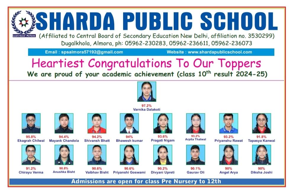 अल्मोड़ा-शारदा पब्लिक स्कूल में कक्षा 12 वीं और 10 वीं के बोर्ड परीक्षा परिणाम घोषित किए गए हैं।इस वर्ष भी विद्यालय का प्रदर्शन शत प्रतिशत रहा जिसमें विद्यार्थियों ने उत्कृष्ट अंक प्राप्त कर विद्यालय का नाम गौरवान्वित किया।कक्षा 12वीं में कृतिका पांडेय ने 97.6% अंक प्राप्त कर विद्यालय में प्रथम स्थान प्राप्त किया।द्वितीय स्थान देवांगना त्रिपाठी (97%) ने प्राप्त किया।तृतीय स्थान पर संयुक्त रूप से श्रृष्टि साह और लता तिवारी रहीं दोनों ने 96.8% अंक प्राप्त किए।कुल 12 विद्यार्थियों ने 90 प्रतिशत से अधिक अंक प्राप्त किए जो कि विद्यालय की उत्कृष्ट शैक्षणिक गुणवत्ता का प्रमाण है।