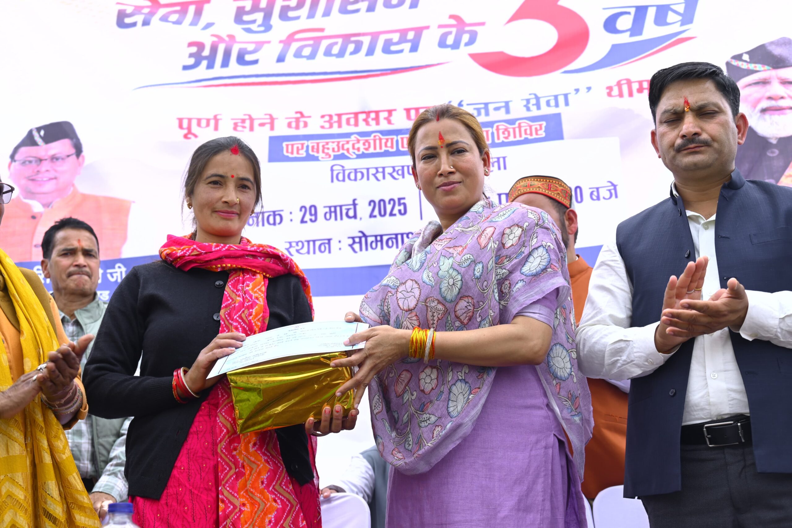 सोमेश्वर-वर्तमान सरकार के तीन वर्ष पूर्ण होने के अवसर पर सेवा, सुशासन एवं विकास के तीन वर्ष के तहत जन सेवा थीम पर शनिवार को बहुउद्देशीय एवं चिकित्सा शिविर का आयोजन कैबिनेट मंत्री रेखा आर्य की अध्यक्षता में सोमनाथ मैदान सोमेश्वर में आयोजित हुआ।इस शिविर में बड़ी संख्या में लोगों ने प्रतिभाग किया।लोगों की विभिन्न समस्याओं का समाधान मौके पर ही हुआ तथा कई शिकायतों को अग्रेषित किया गया।कैबिनेट मंत्री रेखा आर्य ने सरकार के तीन वर्ष सफलतापूर्वक पूर्ण होने के अवसर पर क्षेत्र एवं राज्य की जनता को बधाई दी।उन्होंने क्षेत्रीय जनता को प्रणाम करते हुए कहा कि आपकी अपेक्षाओं एवं आकांक्षाओं के अनुरूप वर्तमान सरकार राज्य के विकास को समर्पित है।लगातार राज्य के विकास में अभूतपूर्वक कार्य किए जा रहें हैं।राज्य में मुख्यमंत्री पुष्कर सिंह धामी के नेतृत्व में लगातार जन भावना के अनुरूप कार्य किए जा रहे हैं।सेवा, सुशासन और विकास के ये तीन साल राज्य के विकास का प्रतिबिंब प्रस्तुत करते हैं।उन्होंने कहा कि इस कार्यक्रम का उद्देश्य लोगों को अधिक से अधिक लाभान्वित करना एवं उनकी समस्याओं का समाधान करना है।कैबिनेट मंत्री ने मौके पर ही शिकायतों का संज्ञान लिया तथा एक एक शिकायत के बारे में संबंधित अधिकारी को निर्देश दिए कि यहां आई सभी समस्याओं को प्राथमिकता से निस्तारित करें।लंबित शिकायतों के प्रति नाराजगी जाहिर करते हुए उन्होंने मौके पर ही शिकायतकर्ताओं एवं विभागीय अधिकारियों का संवाद कराया तथा शिकायत के निस्तारण में क्या समस्याएं आ रहीं हैं उसकी जानकारी ली।उन्होंने अधिकारियों को कड़े निर्देश दिए कि लोगों को अपने कार्यों के लिए कार्यालयों के चक्कर न काटने पड़े,बल्कि उनकी समस्याओं का समाधान जल्द से जल्द करें।उन्होंने शिविर में अनुपस्थित अधिकारियों के प्रति नाराजगी जाहिर करते हुए स्पष्टीकरण जारी करने के निर्देश दिए।शिविर में किसी ने पानी की समस्या को कैबिनेट मंत्री के सम्मुख रखा तो किसी ने बिजली के बिलों में गड़बड़ी की शिकायत की।कैबिनेट मंत्री ने सभी शिकायतों का संज्ञान लिया एवं अधिकारियों को निर्देश दिए कि समस्याओं का समाधान प्राथमिकता से करें।इस शिविर में कुल 50 शिकायतें आई जिनमें से अधिकतर शिकायतों का मौके पर ही निस्तारण हुआ अन्य शिकायतों को अग्रेषित किया गया। इस शिविर में क्षेत्र में उत्कृष्ट कार्य करने वाली शख्सियतों को कैबिनेट मंत्री द्वारा प्रशस्तिपत्र देकर सम्मानित भी किया गया।इस शिविर में जनपद के विभागों ने अपने अपने विभाग से संबंधित योजनाओं के स्टाल भी लगाए तथा लोगों ने इस स्टालों के माध्यम से योजनाओं की जानकारी प्राप्त करने के साथ साथ योजनाओं का लाभ उठाया