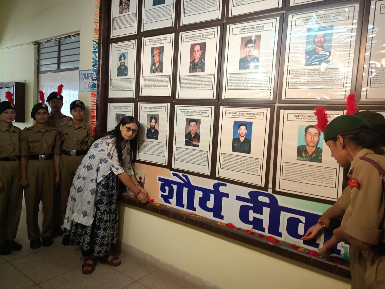 अल्मोड़ा-सोबन सिंह जीना विश्वविद्यालय अल्मोड़ा 24 यूके बालिका वाहिनी एन सी सी की लेफ्टिनेंट (डॉ)ममता पंत के निर्देशन में 26/7/2025 को कारगिल विजय दिवस के अवसर पर परिसर अल्मोड़ा में स्थित शहीद स्मारक एवं शौर्य दीवार में पुष्प अर्पण किए गए तथा परिसर में चित्रकला प्रतियोगिता का भी आयोजन किया गया।जिसमें एन सी सी की कैडेट्स के द्वारा भाग लिया गया।इस प्रतियोगिता के अंतर्गत 45 कैडेट्स द्वारा प्रतिभाग किया गया। जिसमें से प्रथम स्थान पर कैडेट सोनिया,द्वितीय स्थान पर कैडेट पायल तिवारी तथा तृतीय स्थान पर कैडेट प्राची गोस्वामी रहे।प्रतियोगिता के पश्चात कैडेट्स को संबोधित करते हुए लेफ्टिनेंट (डॉ) ममता पंत ने कहा कि देश की सेवा एवं रक्षा हमारा सबसे बड़ा धर्म है।हमें अपने सैनिकों के त्याग और बलिदान को हमेशा याद रखना चाहिए साथ ही उनके संघर्ष से प्रेरणा लेनी चाहिए और अपने देश के लिए हमेशा कुछ अच्छा करने का संकल्प लेना चाहिए।इस अवसर पर अंडर ऑफिसर बरखा मुस्यूनी,सार्जेंट निधि मेहता,सार्जेंट आकांक्षा पिलख्वाल उपस्थित रहे।