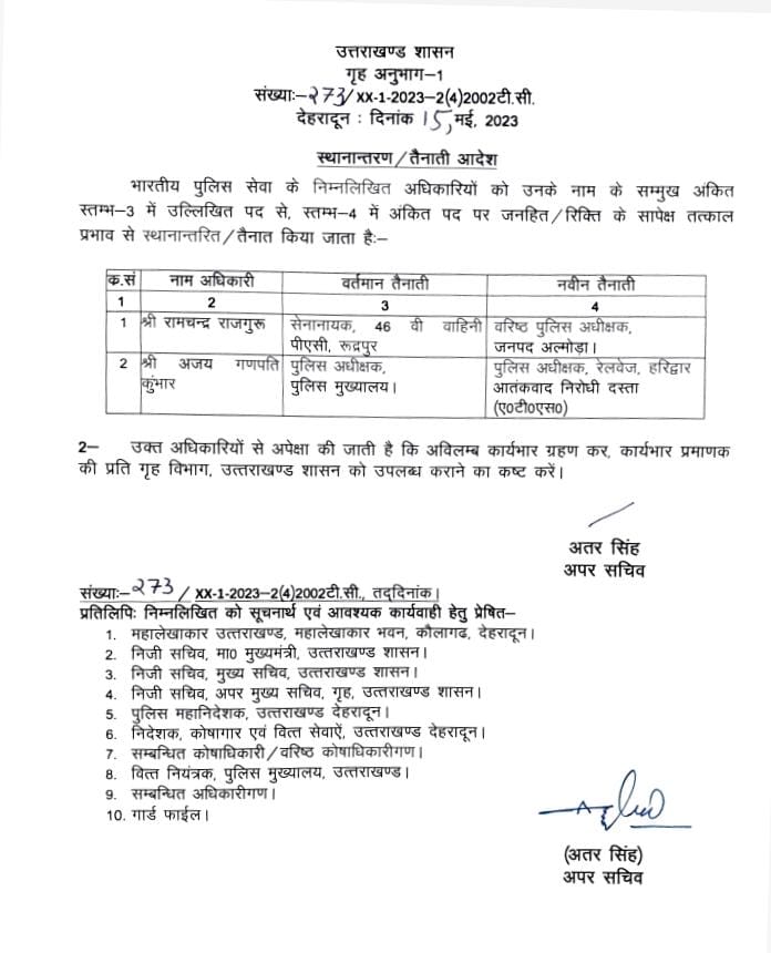 अल्मोडा-अल्मोड़ा वरिष्ठ पुलिस अधीक्षक श्रीमती रचिता जुयाल का स्थानांतरण हो गया है।वे प्रतिनियुक्ति पर आई बी दिल्ली स्थानांतरित हो गई है।रामचंद्र राजगुरु को अल्मोड़ा के नए वरिष्ठ पुलिस अधीक्षक की कमान मिली है।