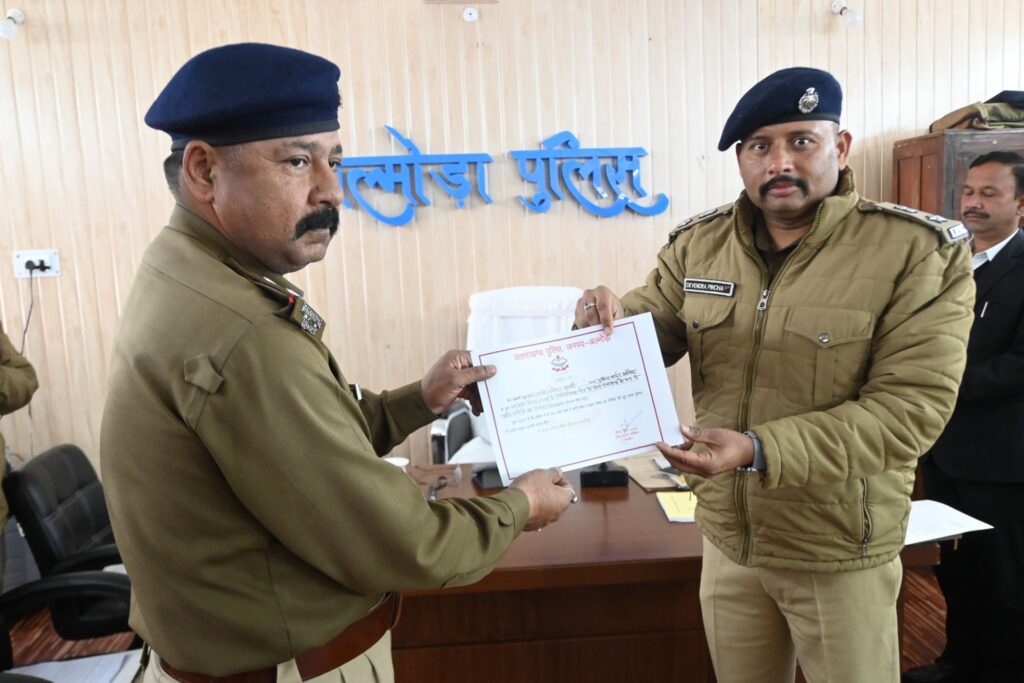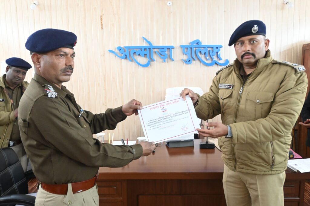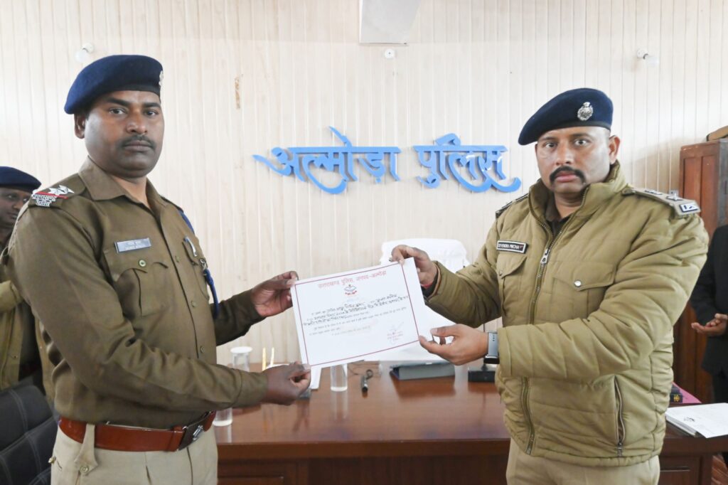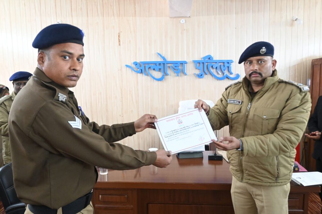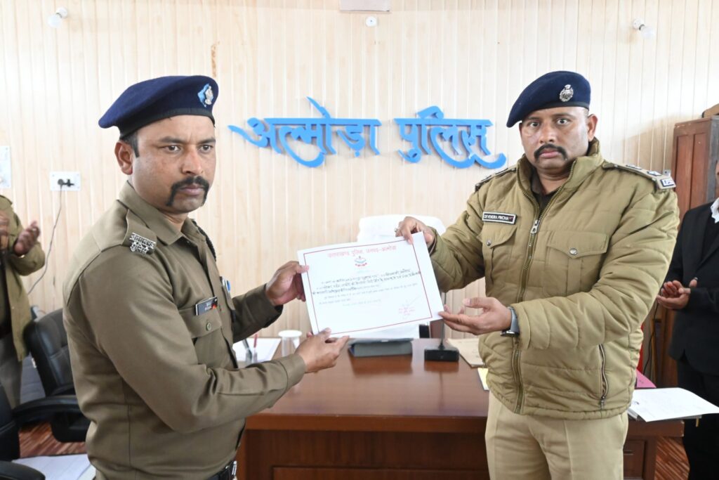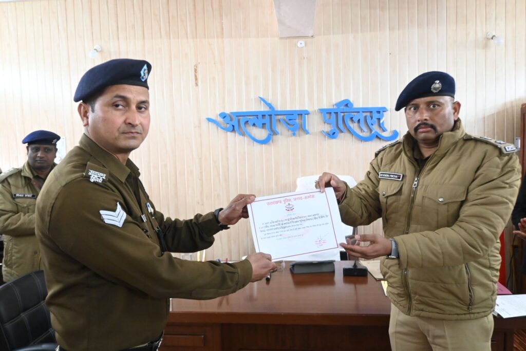 इसके अतिरिक्त वरिष्ठ पुलिस अधीक्षक द्वारा जनपद के राजपत्रित अधिकारी सीओ अल्मोड़ा विमल प्रसाद,सीओ संचार राजीव टम्टा व सीएफओ अल्मोड़ा नरेन्द्र सिंह कुवंर को सौपे गये दायित्वों का कुशलतापूर्वक निर्वहन करने व अधीनस्थों के कार्यों का बेहतर पर्यवेक्षण करने पर उक्त अधिकारियों की प्रशंसा करते हुए प्रशस्ति पत्र से सम्मानित किया गया।इस अवसर पर सीओ अल्मोड़ा विमल प्रसाद,सीओ संचार राजीव कुमार टम्टा,प्रभारी ज्येष्ठ अभियोजन अधिकारी बिंदेश्वरी प्रसाद टम्टा,प्रतिसार निरीक्षक विजय विक्रम, प्रभारी निरीक्षक कोतवाली अल्मोड़ा जगदीश चन्द्र देउपा, प्रभारी निरीक्षक कोतवाली रानीखेत हिमांशु पंत, निरीक्षक एलआईयू कमल पाठक निरीक्षक दूरसंचार उमाशंकर पाण्डे,एफएसओ महेश चन्द्र, निरीक्षक यातायात दरबान सिंह, निरीक्षक एसडीआरएफ अर्जुन सिंह बिष्ट सहित जनपद के सभी थाना/एसओजी/एएनटीएफ एवं समस्त शाखा प्रभारी व अन्य कर्मचारी गण मौजूद रहे।
