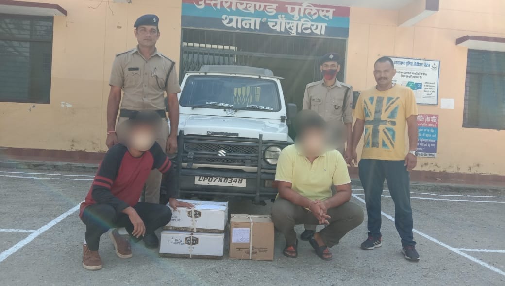 अल्मोड़ा-दिनांक 27.09.2021 को उप निरीक्षक देवेन्द्र सिंह राणा मय पुलिस टीम के दौराने चैकिंग जौरासी रोड चौखुटिया के पास अभियुक्तगण राजेश तिवारी पुत्र स्व० प्रेम बल्लब तिवारी निवासी कफडा थाना द्वाराहाट जिला अल्मोड़ा तथा मेहुल नागर पुत्र आशीष नागर निवासी A 148 नेहरू नगर जिला गाजियाबाद उ०प्र० के पास वाहन संख्या UP 07 K 8348 (जिप्सी) में 3 पेटी अवैध अंग्रेजी शराब कीमत करीब 14800 रुपये परिवहन करते हुए गिरफ्तार कर थाना चौखुटिया में F.I.R. NO-29/21 धारा 60/72 आबकारी अधिनियम बनाम उपरोक्त पंजीकृत कर वैधानिक कार्रवाई की गयी।अवैध शराब के परिवहन में प्रयुक्त वाहन को सीज कर आवश्यक कार्यवाही की गयी।उक्त मामले में थानाध्यक्ष चौखुटिया दिनेश नाथ महंत ने बताया कि अभियुक्त राजेश तिवारी एफ०एल०टू० गोदाम का मालिक तथा मेहुल नागर उपरोक्त एल०एल०बी० का छात्र है,जो शराब को अवैध रूप से बेचने हेतु जौरासी, पाण्डुवाखाल की तरफ जा रहे थे, पकड़ में आने पर कार्यवाही की गयी।