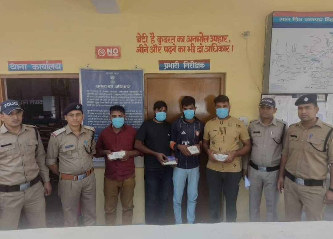 टिहरी-वरिष्ठ पुलिस अधीक्षक टिहरी गढ़वाल नवनीत सिंह भुल्लर के निर्देशन में चारधाम यात्रा के दृष्टिगत जनपद में लगातार सघन चैकिंग की जा रही है।इसी क्रम में दिनांक 4/05/2022 को समय करीब 7 बजे सांय को थाना देवप्रयाग को सूचना प्राप्त हुयी कि कुछ लोग जाली नोट देकर खरीदारी कर रहे हैं।उक्त सूचना पर तत्काल कार्यवाही करते हुये प्रभारी निरीक्षक देवप्रयाग द्वारा उच्चाधिकारीयों के निर्देशानुसार वरिष्ठ उप निरीक्षक थाना देवप्रयाग के नेतृत्व में एक टीम का गठन किया गया तथा थाना देवप्रयाग क्षेत्रांतर्गत सघन चैकिंग कराई गई।चैकिंग के दौरान तहसील चौक देवप्रयाग में कुछ व्यक्तियों द्वारा पुलिस की चैकिंग को देखते हुये अपना वाहन तेजी से निकालने की कोशिश की जिस पर पुलिस द्वारा उक्त वाहन (HR 10AC-9147 WAGON R) को जबरन रोककर उक्त वाहन में बैठे 4 व्यक्तियों एवं वाहन की तलाशी ली गयी तो उनके कब्जे से 200 रुपये के 4 जाली नोट बरामद हुये जिस पर उक्त 4 व्यक्तियों की तत्काल गिरफ्तारी कर उनके विरुद्ध थाना देवप्रयाग पर मुकदमा अपराध संख्या 10/ 2022 धारा 489 ए,बी,सी भादवि के अंतर्गत अभियोग पंजीकृत किया गया।अभियुक्तगणों से पूछताछ की गयी तो उनके द्वारा बताया गया कि हम लोग गुड़गांव हरियाणा में जाली नोटों को प्रिंट करते है तथा अलग अलग शहरों में जाकर दुकानदारों से छोटी छोटी चीजें लेकर नोटों को असली के रूप में चलाते हैं हम लोगों को यह पता चला कि चारधाम यात्रा चलने वाली है। जिसमें भारी संख्या में यात्री आते है। अतः हम लोग रुद्रप्रयाग तक गये थे जहां से हमने वापसी के दौरान कई जगह नकली चलाये थे अब हमारी योजना जाली नोटों की बडी खेप लेकर उसको यहां चारधाम यात्रा मार्गों पर चलाने की थी।पूछताछ में यह भी प्रकाश मे आया कि एक अभियुक्त सचिन दिल्ली पुलिस मे आरक्षी के पद पर नियुक्त है।अभियुक्त गणों से विभिन्न स्थानों पर दिये गये जाली नोटों के सम्बन्ध में विस्तृत पूछताछ की जा रही है।अभियुक्तों की पहचान सचिन पुत्र राजकुमार निवासी ग्राम छपरा थाना राय जिला सोनीपत हरियाणा उम्र 35 वर्ष,हितेश पुत्र ओमप्रकाश निवासी बीपीओ थाना कुंड जिला रेवाड़ी हरियाणा उम्र 22 वर्ष,दीपक कुमार पुत्र जगदीश सिंह निवासी ग्राम छपरा बहादुरपुर थाना कुंडली जिला सोनीपत हरियाणा उम्र 35 वर्ष,मोहित पुत्र रविंद्र कुमार निवासी बीपीओ थाना कुंड जिला रेवाड़ी हरियाणा उम्र 29 वर्ष के रूप में हुई है।पुलिस टीम में प्रभारी निरीक्षक थाना देवप्रयाग देवराज शर्मा,वरिष्ठ उप निरीक्षक अनिरुद्ध मैथानी,कांस्टेबल 126 राजकुमार,कॉन्स्टेबल 288 रविंद्र चौहान शामिल रहे।