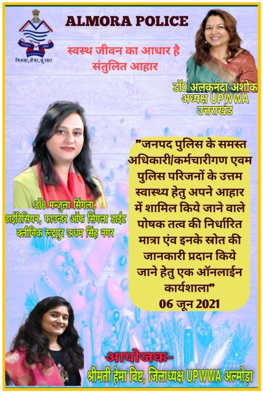 अल्मोड़ा-उत्तराखंड पुलिस वाइव्स वेलफेयर एसोसिएशन के अध्यक्ष डॉ० अलकनंदा अशोक की पहल पर अल्मोड़ा UPWWA द्वारा पुलिस कार्मिक एवं पुलिस परिजनों का ख्याल रखा जा रहा है।इसी क्रम में आज श्रीमती हेमा बिष्ट जिलाध्यक्ष UPWWA जनपद अल्मोड़ा द्वारा जनपद पुलिस के समस्त अधिकारी एवमं कर्मचारीगण के उत्तम स्वास्थ्य हेतु अपने आहार में शामिल किये जाने वाले पोषक तत्व (प्रोटीन, फैट, कार्बोहाइड्रेट,मल्टीविटामिन,मिनरल्स आदि) की निर्धारित मात्रा एंव इनके स्रोत की जानकारी प्रदान किये जाने हेतु एक ऑनलाईन सैशन आयोजित किया गया।कार्यक्रम का ऑनलाइन संचालन एसओजी प्रभारी नीरज भाकुनी द्वारा किया गया।इस सैशन में मुख्य वक्ता के रूप में डाईटिसियन डॉ० मन्जुला सिंगला,फाउन्डर ऑफ सिंगला डाईट क्लीनिक रूद्रपुर ऊधम सिंह नगर द्वारा समस्त पुलिस परिवार को लाभप्रद जानकारी प्रदान की गयी।डॉ० सिंगला द्वारा बताया गया कि पुलिस की व्यस्त जीवन शैली में पुलिस कर्मी के दैनिक आहार में माइक्रो न्यूट्रिएन्टस एवं मल्टीविटामिन एवं मिनरल्स की विशेषतः कमी रहती है जिसका दुष्प्रभाव उनके शरीर में पड़ता हैं और वह डाईबिटीज,हॉर्ट डिजीज, हायपर टैन्शन,डाईजैस्टिव डिसऑर्डर, लो इम्यून सिस्टम आदि समस्याओं से ग्रसित हो जाते हैं।उन्होंने बताया कि अपने आहार में हैल्दी फूड्स शामिल कर इन समस्याओं से निजात पाया जा सकता है।डॉ० सिंगला ने बताया कि स्वस्थ शरीर बनाये रखने के लिए आप अपने आहार में किन-किन फूडस को शामिल करें और किस प्रकार के अनहैल्दी फूडस से दूर रहें।डॉ० सिंगला द्वारा पुलिस कर्मियों के प्रश्नों का उत्तर देकर भविष्य में भी उक्त विषय पर मार्गदर्शन किये जाने का आश्वासन दिया गया।उत्तम एंव निरोगी काया हेतु अपनी जीवन शैली में हैल्दी फूड एवमं शारीरिक व्यायाम को शामिल करना अत्यन्त आवश्यक है।लाईव सैशन के अन्त में श्रीमती हेमा बिष्ट द्वारा समस्त पुलिस अधिकारी एवमं कर्मचारी गण को सम्बोधित करते हुए कहा कि शरीर एक अमूल्य धरोहर है जिसके रोग ग्रसित होने पर आप ही नही वरन आपका पूरा परिवार प्रभावित होता है और उन्होंने अपेक्षा की कि सभी पुलिस कर्मी इस उपयोगी सैशन के बाद अपने शरीर एंव आहार के प्रति ध्यान देंगे,साथ ही उन्होने लाभप्रद जानकारी प्रदान किये जाने हेतु डॉ मंजुला सिंगला का आभार प्रकट करते हुए धन्यवाद ज्ञापित किया।ऑनलाइन कार्यक्रम में जनपद के सभी थाना प्रभारी/चौकी प्रभारी/ शाखा प्रभारी/सभी उपनिरीक्षक अन्य कर्मचारियों के साथ पुलिस परिवार के परिजन भी शामिल रहे।