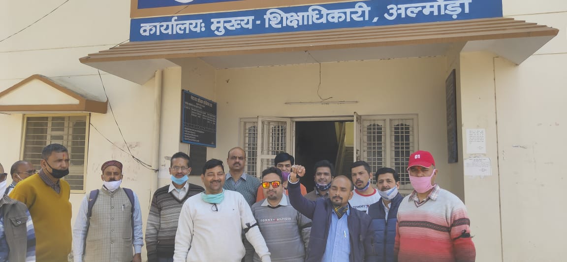 अल्मोड़ा-उत्तरांचल फैडरेशन ऑफ मिनिस्टीरियल सर्विसेज एसोसिएशन उत्तराखंड के आह्वान पर 21 सूत्रीय मांगों के निराकरण के लिए काली पट्टी कार्यक्रम दिनांक 31 मार्च 2021 तक जारी रहेगा।जिला मुख्यालय अल्मोड़ा में काली पट्टी कार्यक्रम के दूसरे दिन आज शिक्षा विभाग के कार्यालय में मंडल अध्यक्ष धीरेन्द्र कुमार पाठक, जनपद सचिव पुष्कर सिंह भैसोड़ा, जिला उपाध्यक्ष एजुकेशनल मिनिस्ट्रीयल आफीसर्स एसोसिएशन मुकेश चन्द्र जोशी,गोविन्द मेहता, योगेन्द्र बिष्ट,संजू कनवाल,राम सिंह गैंडा,हेमंत जोशी,भगवान राम,रमेश चंद्र तिवारी,अवनीश पडियार,अर्जुन नेगी,दीप चन्द्र पाण्डेय,प्रशांत शर्मा, मोहित डौरबी,हयात सिंह जैम्याल,नरेंद्र नेगी,रवि राज सिंह साह आदि द्वारा काली पट्टी बांध कर शासन की नीतियों का विरोध किया गया।