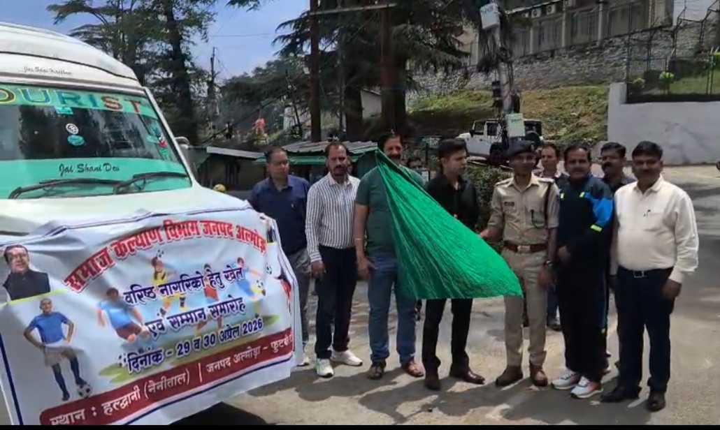 अल्मोड़ा-समाज कल्याण विभाग उत्तराखण्ड एवं उत्तराखण्ड वरिष्ठ नागरिक कल्याण परिषद के संयुक्त तत्वावधान में दिनांक 29 एवं 30 अप्रैल 2026 को हल्द्वानी (नैनीताल) में वरिष्ठ नागरिकों हेतु खेल एवं सम्मान कार्यक्रम आयोजित किया जा रहा है।इसी क्रम में आज जनपद अल्मोड़ा की वरिष्ठ नागरिकों की फुटबॉल टीम को जिलाधिकारी अंशुल सिंह एवं वरिष्ठ पुलिस अधीक्षक चन्द्रशेखर घोड़के द्वारा रघुनाथ सिटी मॉल अल्मोड़ा से प्रतियोगिता में प्रतिभाग हेतु हरी झंडी दिखाकर रवाना किया गया।जिलाधिकारी ने टीम के सभी सदस्यों को शुभकामनाएं दी ।जिलाधिकारी ने कहा कि कार्यक्रम के माध्यम से वरिष्ठ नागरिकों में खेल भावना को प्रोत्साहित करने तथा उनके योगदान को सम्मानित करने का उद्देश्य है।टीम में जनपद के वरिष्ठ खिलाड़ी जंग बहादुर थापा,मनोज सनवाल,आशीष वर्मा,अनुप साह,डॉ. जे.सी. दुर्गापाल,नरेन्द्र सिंह,राजेन्द्र प्रसाद गुरूरानी,कमालउद्दीन, करन सिंह मर्तोलिया,हीरा सिंह रावत एवं नरेन्द्र सिंह बिष्ट सहित अन्य खिलाड़ी शामिल हैं।इस अवसर पर जिला समाज कल्याण अधिकारी शैलेन्द्र पाण्डे,टीम कोच हरीश कनवाल तथा विभागीय कार्मिक भी उपस्थित रहे।