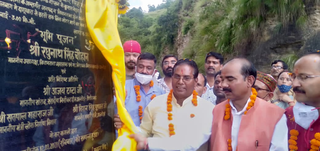 अल्मोड़ा-अल्मोड़ा नगर से लगे सरसों ग्राम हेतु दामूधारा से सरसों तक लिंक मोटर मार्ग का भूमि पूजन विधानसभा उपाध्यक्ष रघुनाथ सिंह चौहान व सांसद अजय टम्टा द्वारा किया गया।3 किमी० लम्बे मोटर मार्ग हेतु 50 लाख रू० की धनराशि स्वीकृत की गयी है। सड़क के भूमि पूजन व शिलान्यास कार्यक्रम में बतौर मुख्य अतिथि विधानसभा उपाध्यक्ष ने कहा कि नगर से बिल्कुल समीप सरसों ग्राम की बहुत पुरानी मॉग आज पूरी हो रही है। जिससे यहां उत्पादित होने वाली सब्जियों व दूध आदि को बाजार पहुंचाने में आसानी होगी व गाँव का पलायन रुकेगा।उन्होंने कहा कि विकास हेतु सड़कों का निर्माण प्रत्येक गॉव स्तर तक पहुॅचे यह सरकार की मंशा है।आगे इस सड़क को पुलिस लाइन तक मिलाने का प्रयास किया जाएगा।उन्होंने कहा कि उनका प्रयास रहेगा कि क्षेत्र के प्रत्येक गॉव को मोटर मार्ग से जोड़ा जाय।विधानसभा उपाध्यक्ष ने कहा कि लोगों की मूलभूत आवश्यकताओं जिनमें शिक्षा,स्वास्थ्य, रोजगार व सड़क सम्मलित है उन्हें पूर्ण करने का हर सम्भव प्रयास किया जा रहा है।उन्होंने कहा कि निर्माण कार्य में आने वाली छोटी-छोटी समस्याओं का समाधान किया जायेगा।विभागीय अधिकारियों को निर्देश दिये कि निर्माण कार्य तीव्र गति से किया जाय। इस कार्यक्रम में सांसद अजय टम्टा ने अपने विचार रखते हुए कहा इस गांव की काफी लंम्बे समय से सड़क की मांग थी जो आज पूरी हो रही है लोगों को इसका काफी लाभ मिलेगा।उन्होंने कहा कि प्रत्येक गॉव में सड़क सुविधा होने से वहॉ के लोगो को उसका लाभ मिले यह उनकी प्राथमिकता है।उन्होंने अधिकारियों को गुणवत्तापरक कार्य करने के निर्देश भी दिये।भूमि पूजन कार्यक्रम के दौरान स्थानीय ग्रामीणों द्वारा ढोल नगाड़ों से भव्य स्वागत किया गया।क्षेत्रीय जनता ने सभी उपस्थित अतिथियों का आभार व्यक्त किया।प्रधान पिंकी बिष्ट ने सभी का आभार व्यक्त किया।इस अवसर पर कॉपरेटिव बैंक के अध्यक्ष ललित लटवाल,पूर्व दर्जा राज्यमंत्री गोविन्द पिलख्वाल,नगर अध्यक्ष कैलाश गुरुरानी,जिला मंत्री विनीत बिष्ट,हरीश कनवाल,नवीन बिष्ट,संजय साह,कृष्ण बहादुर सिंह,राजेन्द बिष्ट,पूर्व प्रधान नवीन बिष्ट सहित सैकड़ों कार्यकर्ता व जनप्रतिनिधि उपस्थित रहे।