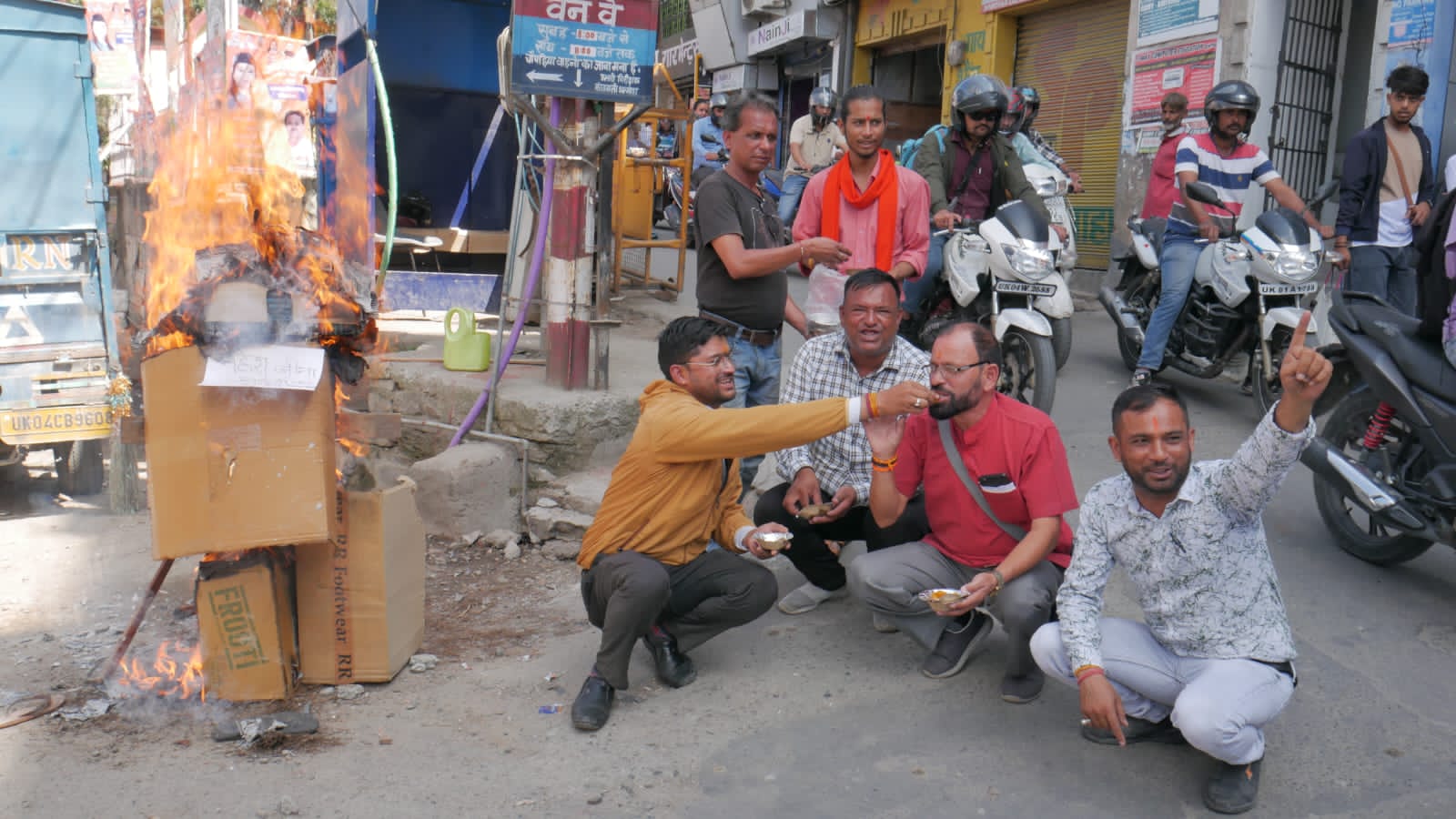 अल्मोड़ा-सल्ट के विधायक महेश जीना एक बार फिर चर्चा में हैं।विश्व हिन्दू परिषद ने सल्ट के विधायक महेश जीना पर कार्यकर्ताओं के साथ अमर्यादित भाषा का प्रयोग करने का आरोप लगाते हुए शिखर चौराहे में उनका पुतला दहन किया तथा पुतला दहन के बाद अन्तिम संस्कार की तर्ज पर आलू भी खाए।साथ ही विधायक से जिला व प्रांत पदाधिकारियों से माफी मांगने की मांग की।आज विश्व हिन्दू परिषद के कार्यकर्ता यहां नगर के शिखर तिराहे पर एकत्र हुए।जहां उन्होंने कार्यकर्ताओं के साथ अमर्यादित भाषा का प्रयोग करने पर सल्ट विधायक महेश जीना का पुतला फूंका तथा विधायक के खिलाफ जमकर नारेबाजी की।इस मौके पर वक्ताओं ने कहा कि विधायक जीना ने विहिप पदाधिकारियों के साथ अमर्यादित भाषा का प्रयोग करते हुए उनके साथ गाली गलौच की और अपने पद का दुरूपयोग करते हुए संगठन के कार्यों में व्यवधान पैदा करने का प्रयास किया।वक्ताओं ने कहा कि एक जनप्रतिनिधि द्वारा इस तरह की अमर्यादित भाषा का प्रयोग करना काफी शर्मनाक हैं।विहिप कार्यकर्ताओं ने चेतावनी दी है कि अगर विधायक महेश जीना ने अपने बयान पर जिला व प्रांत पदाधिकारियों से क्षमा नहीं मांगी तो विहिप पूरे प्रदेश में विधायक के खिलाफ आंदोलन की रणनीति तय करेगी।पुतला दहन कार्यक्रम में प्रांत सह सेवा प्रमुख मंगल सिंह बिष्ट, प्रकाश चंद्र लोहनी,विजय सिंह सिराड़ी,भूपाल मेहता,गोविंद कनवाल, रवि जोशी,विकास पोखरिया,सागर, शिवम आदि मौजूद रहे।