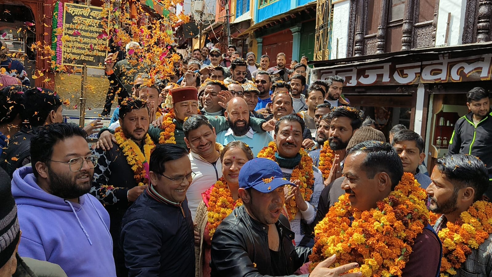 अल्मोड़ा-आज प्रांतीय उद्योग व्यापार नगर मंडल के विजयी प्रत्याशियों का जुलूस अल्मोड़ा पलटन बाजार से बाजार होते हुए चौघानपाटा पर पहुंचा जिसमें मल्ला बाजार ,जोहरी बाजार खजांची बाजार ,कचहरी बाजार चौक बाजार लाला, चोघनपाटा में सभी पदाधिकारियों का भव्य स्वागत किया गया।सभी विजयी प्रत्याशी नगर व्यापार मंडल अध्यक्ष अजय वर्मा, उपाध्यक्ष मुकुल जोशी,उपाध्यक्ष नरेंद्र लाल शाह,महिला उपाध्यक्ष जया साह, महासचिव वकुल साह,कोषाध्यक्ष कुणाल नयाल,उपसचिव अश्विनी नेगी, आशीष कुमार और उनके समर्थकों द्वारा एक विशाल जुलूस के माध्यम से अल्मोड़ा नगर के सभी व्यापारियों का तथा जनता का धन्यवाद दिया गया। जिला व्यापार मंडल द्वारा रघुनाथ मंदिर के पास उनका भव्य स्वागत किया गया तथा बाजार में विभिन्न जगहों पर व्यापारियों द्वारा भी स्वागत किया गया।सभी विजयी प्रत्याशियों ने समस्त व्यापारियों को विश्वास दिलाया है कि वह व्यापारियों की सभी समस्याओं के लिए उनके साथ कंधे से कंधा मिलाकर खड़े रहेंगे।नगर अध्यक्ष अजय वर्मा ने जिला व्यापार मंडल और समस्त व्यापारियों का आभार जताया और भविष्य में किसी भी समस्या से निपटने का भरोसा व्यापारियों को दिया।विजय जलूस में धारानोला, खत्यारी बाजार, सरकार की आली, एनडीडी आदि जगहों के व्यापारी उपस्थित थे।